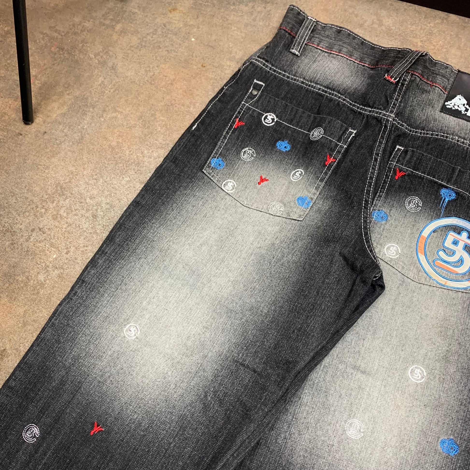 Rare 5ive Jungle jeans with embroidery all over and a plaid patterned graphic on the back right pocket, in a baggy / wide leg fit, coloured washed black / grey all over and in excellent second hand condition with a hole in the belt loop as shown, unnoticeable when worn.