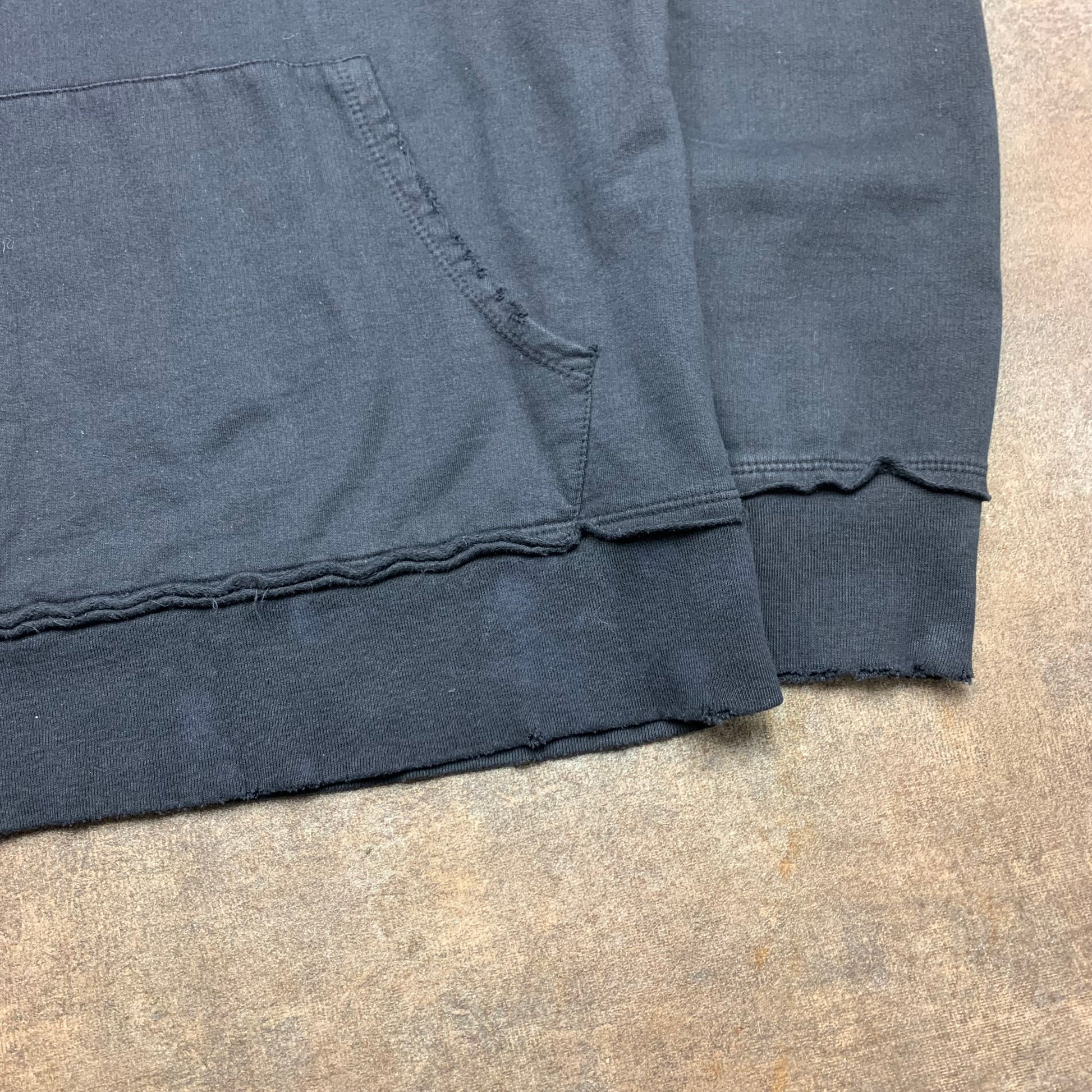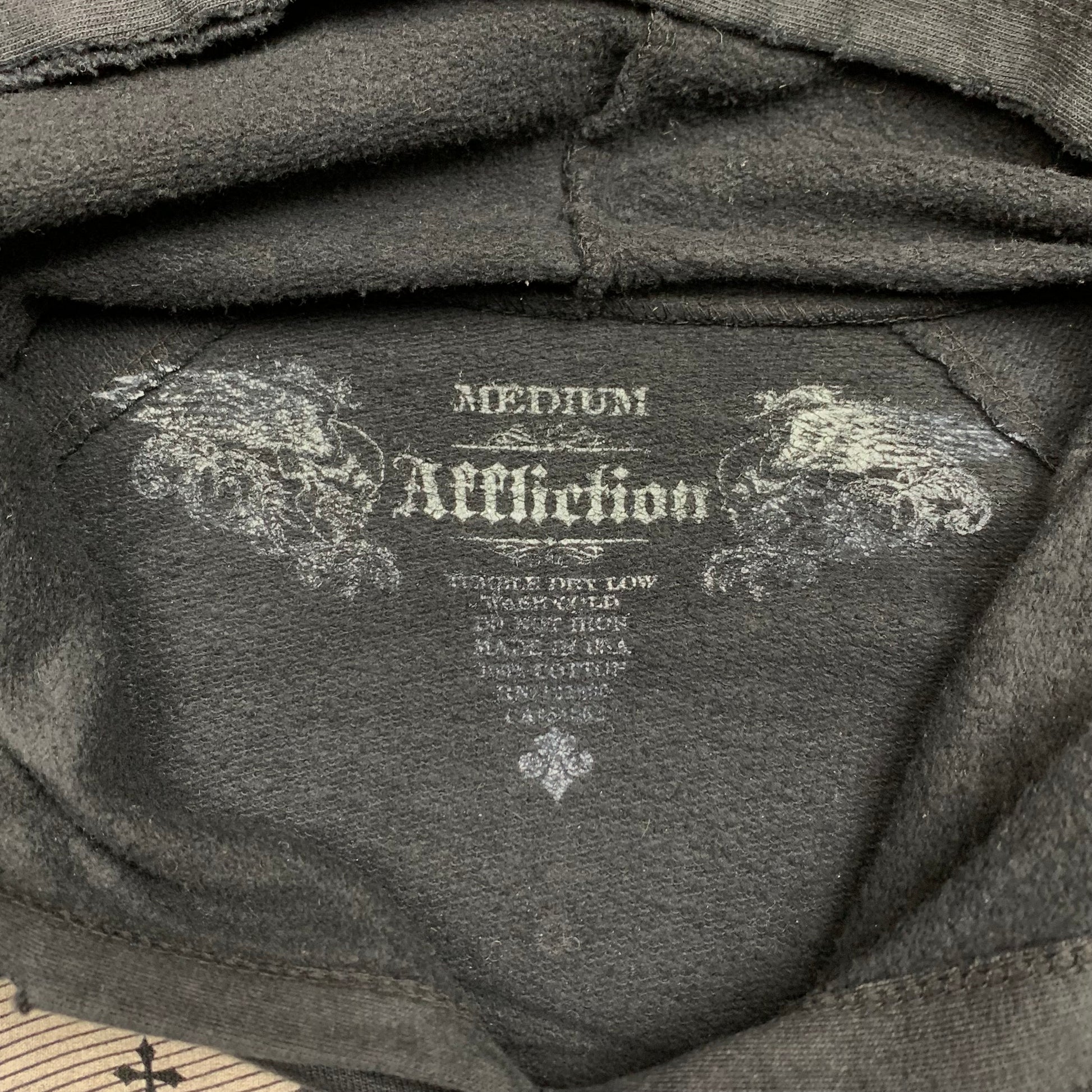 Rare Affliction hoodie with printed graphics on the front, back and sleeves, studs on the graphics, coloured black all over, distressed panelling and in excellent second hand condition with some marks to the bottom of the front and left sleeve, adding to the grunge look.