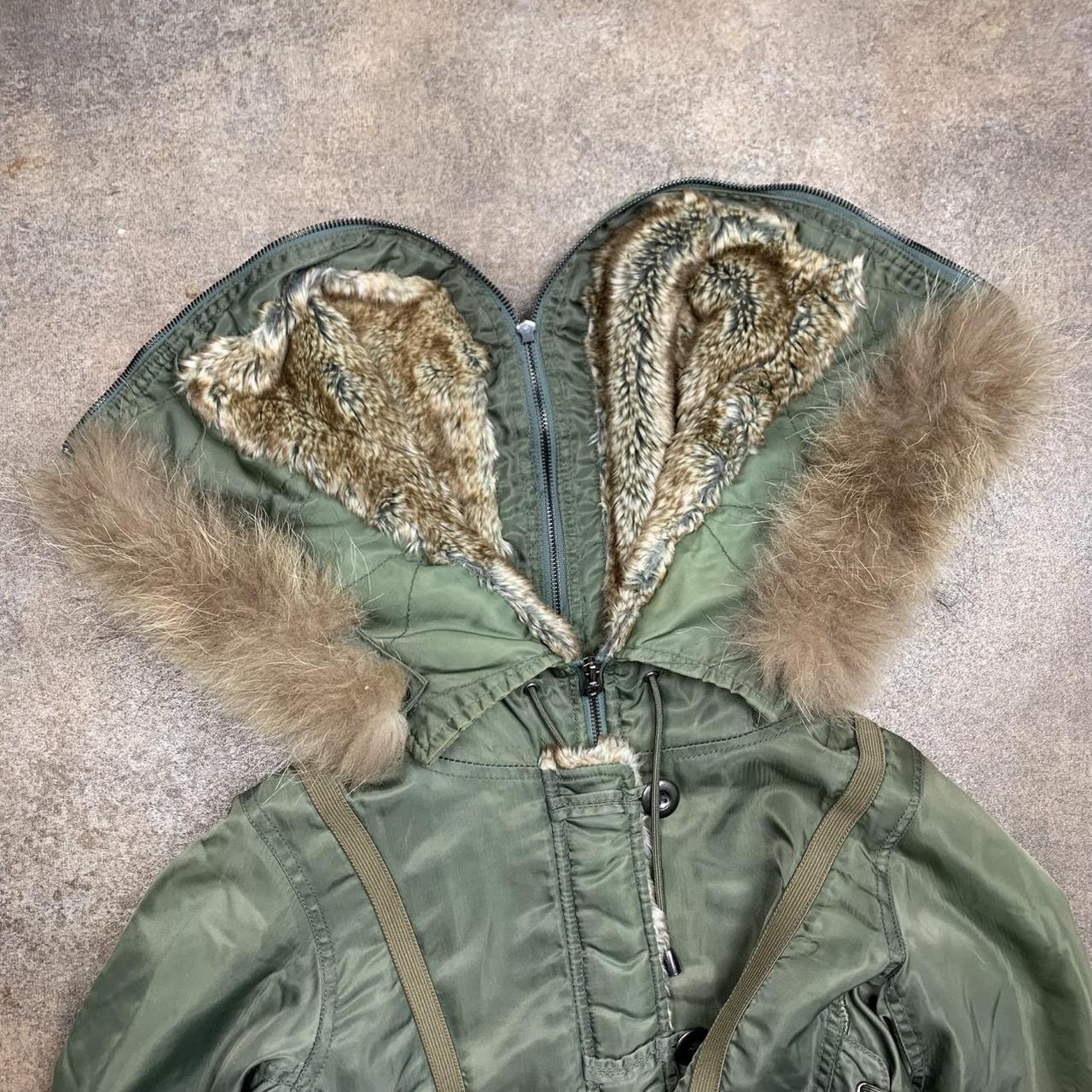 Very rare Avirex jacket with a zip up the back of the hood, full zip & button lines down the front, fur lining in the hood & throughout the inside of the jacket, coloured khaki/green and in excellent second hand condition with minimal wear. Many more utilisations across the jacket.