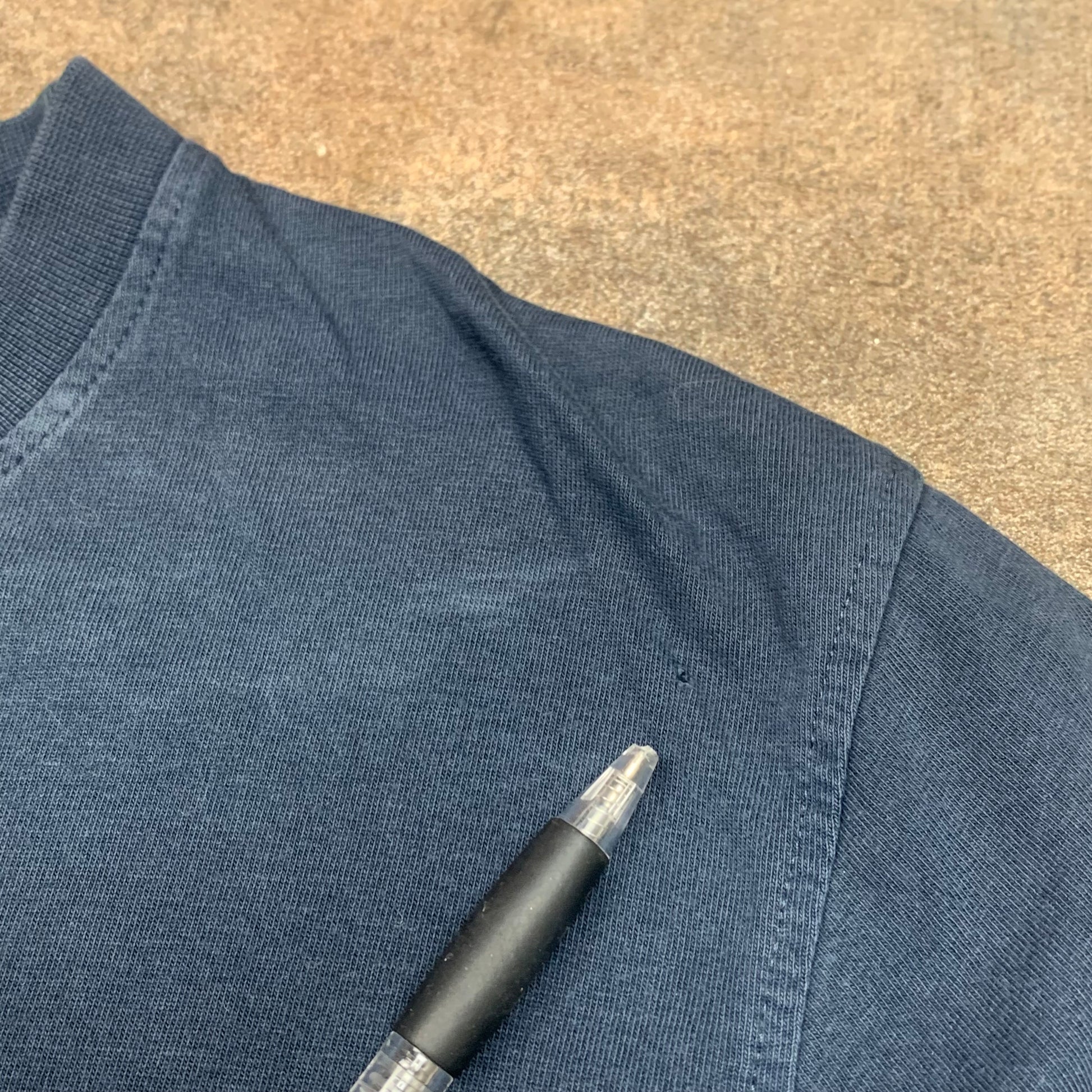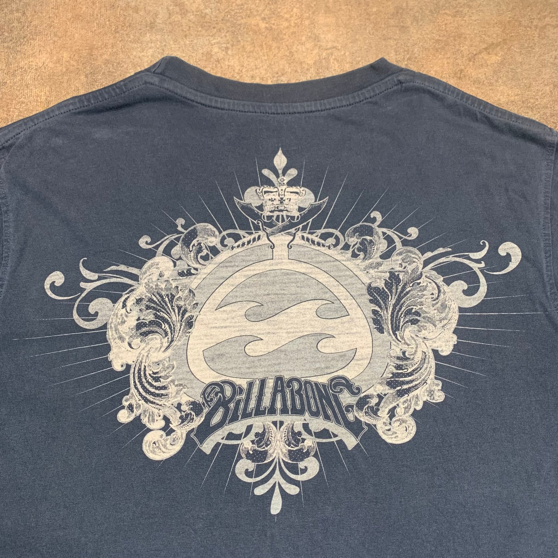 Sick Billabong tee with printed graphics front & back, coloured navy all over & in good second hand condition with a tiny hole at the top of the front as shown in the final photo.