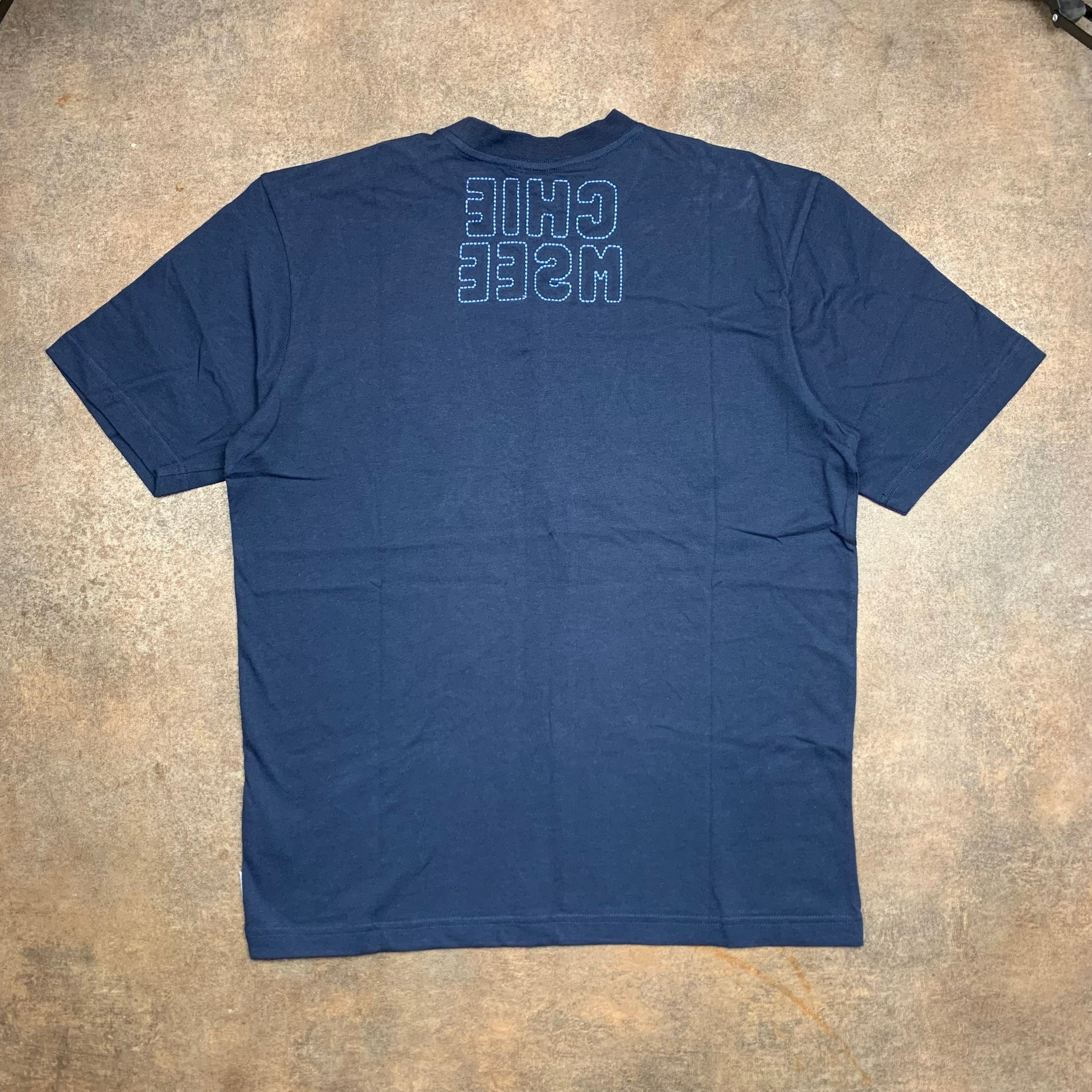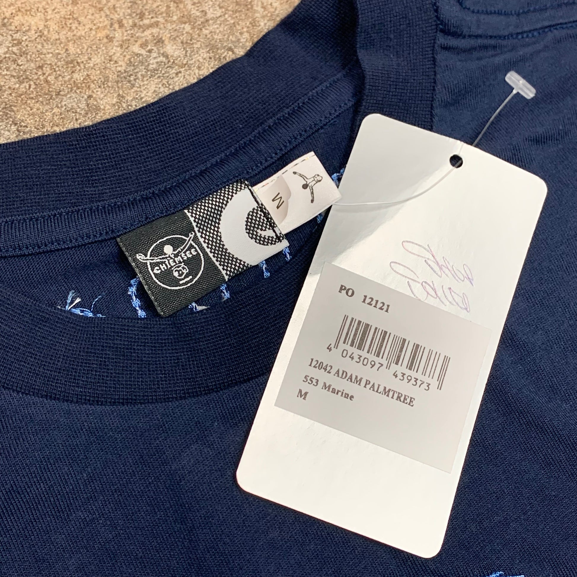 Vintage surfwear tee with blue embroidered graphics front and back, coloured navy all over and in great second hand condition - new with tags aside from fading as shown.