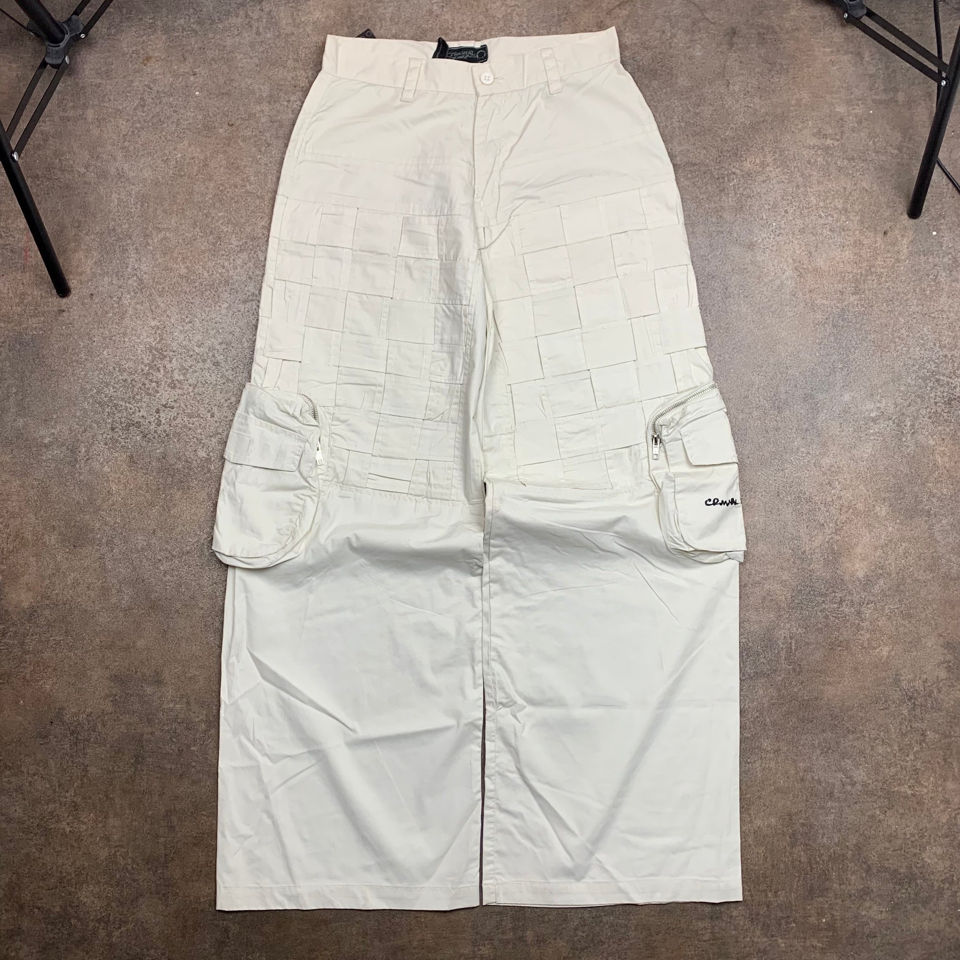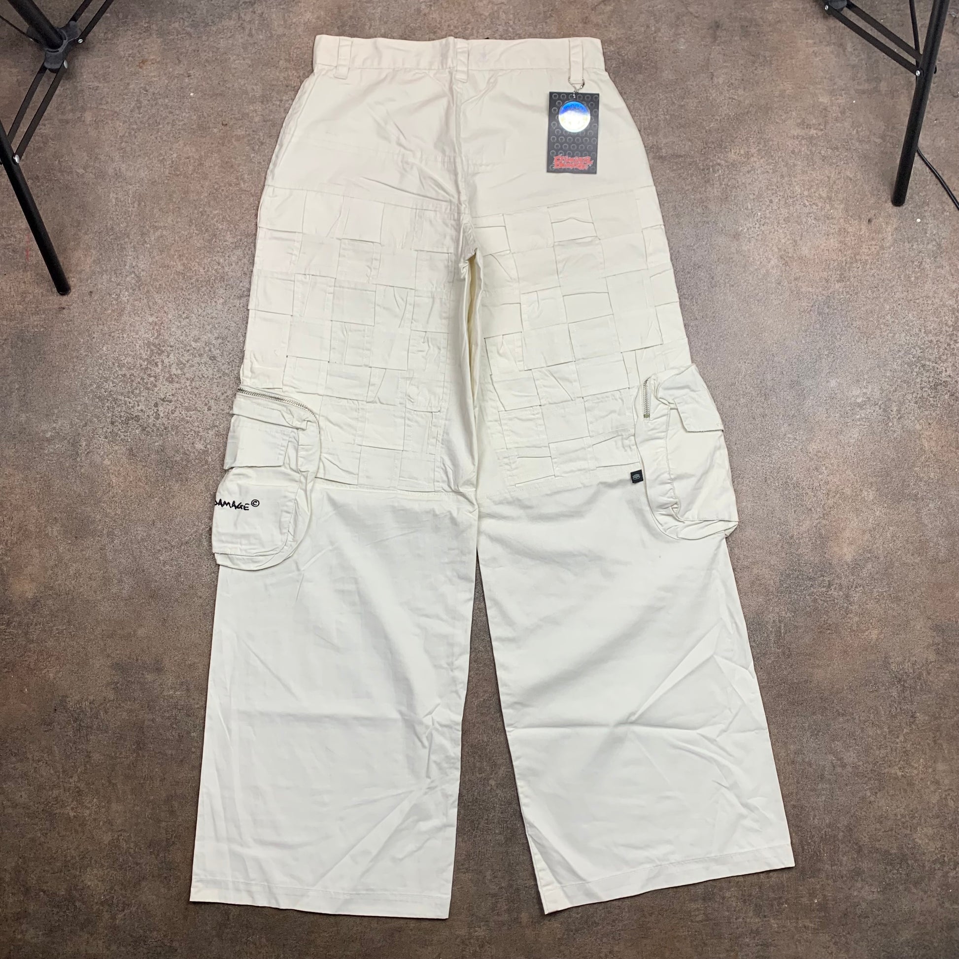 Vintage Criminal Damage jeans with checkered detailing around the top of the trousers, cargo pockets, in a very baggy fit, coloured cream all over & brand new with tags / oxidation to tag chain from age.