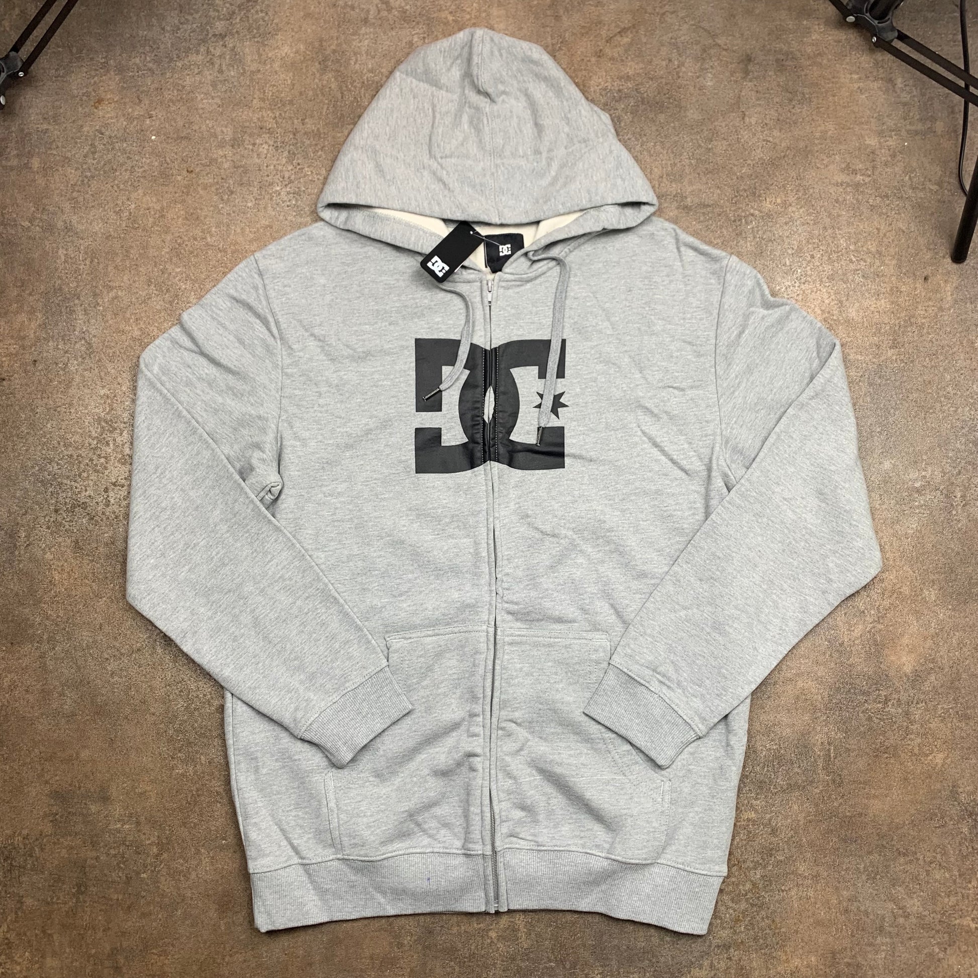 DC Shoes hoodie with a printed big star logo on the front in black, coloured light grey all over and in excellent second hand condition - brand new with tags aside from 2 tiny marks at the bottom of the front as shown.
