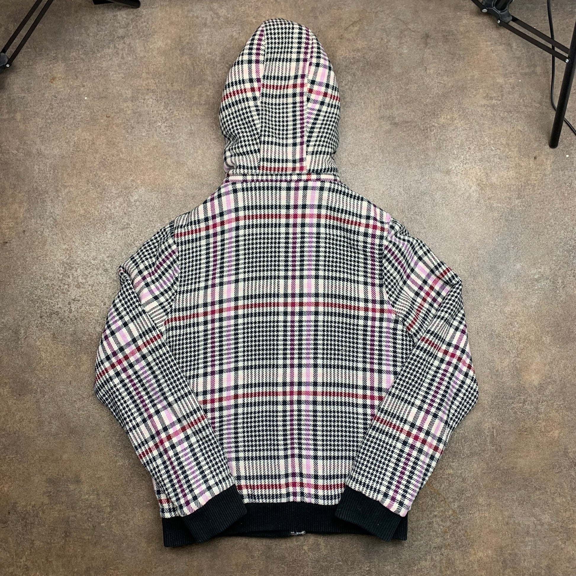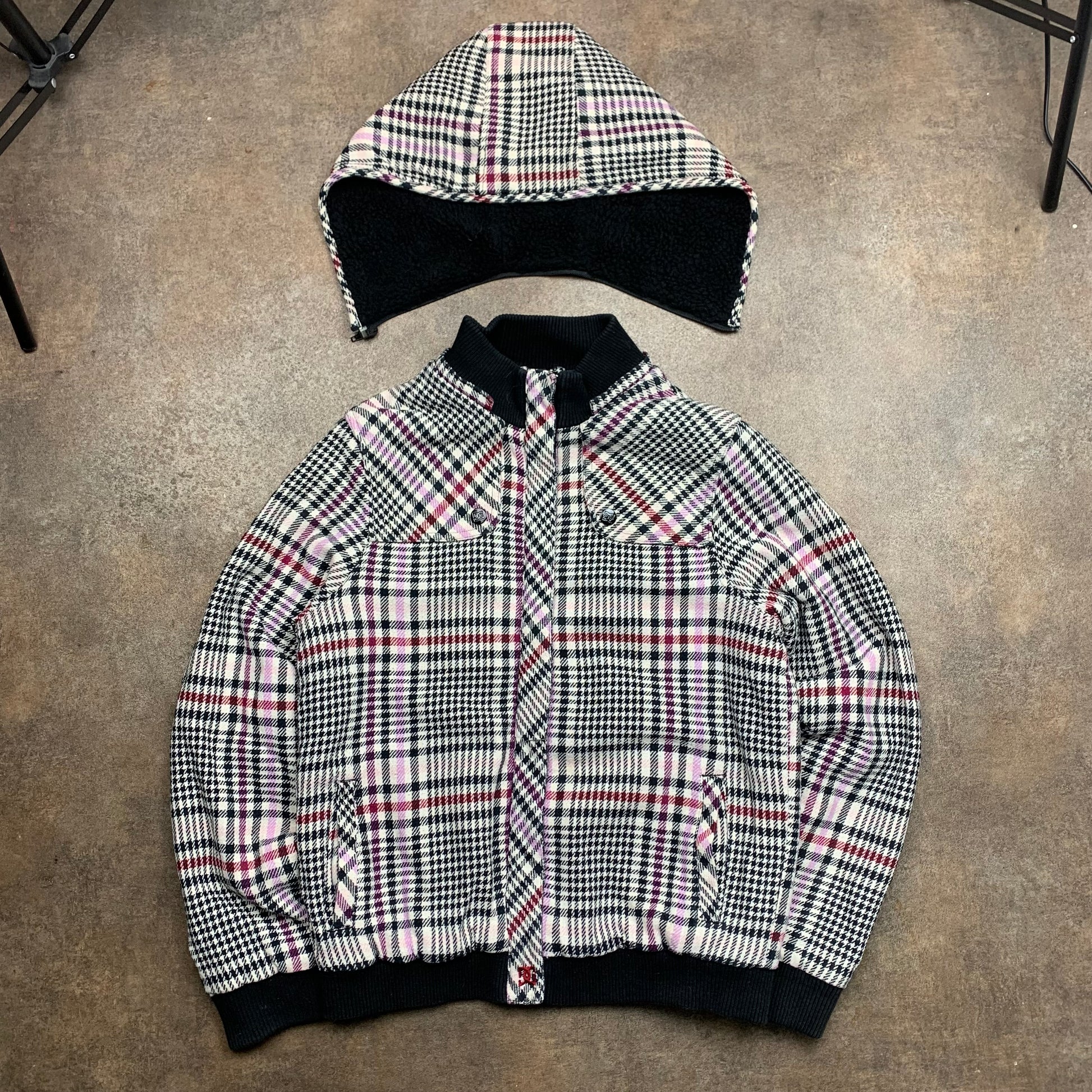 Rare DC hoodie with a plaid pattern all over, fur lined throughout the torso / quilted lining in the sleeves, embroidered big star logo at the bottom of the front, removable hood, button close panels at the top of the front and in excellent second hand condition with little to no wear.