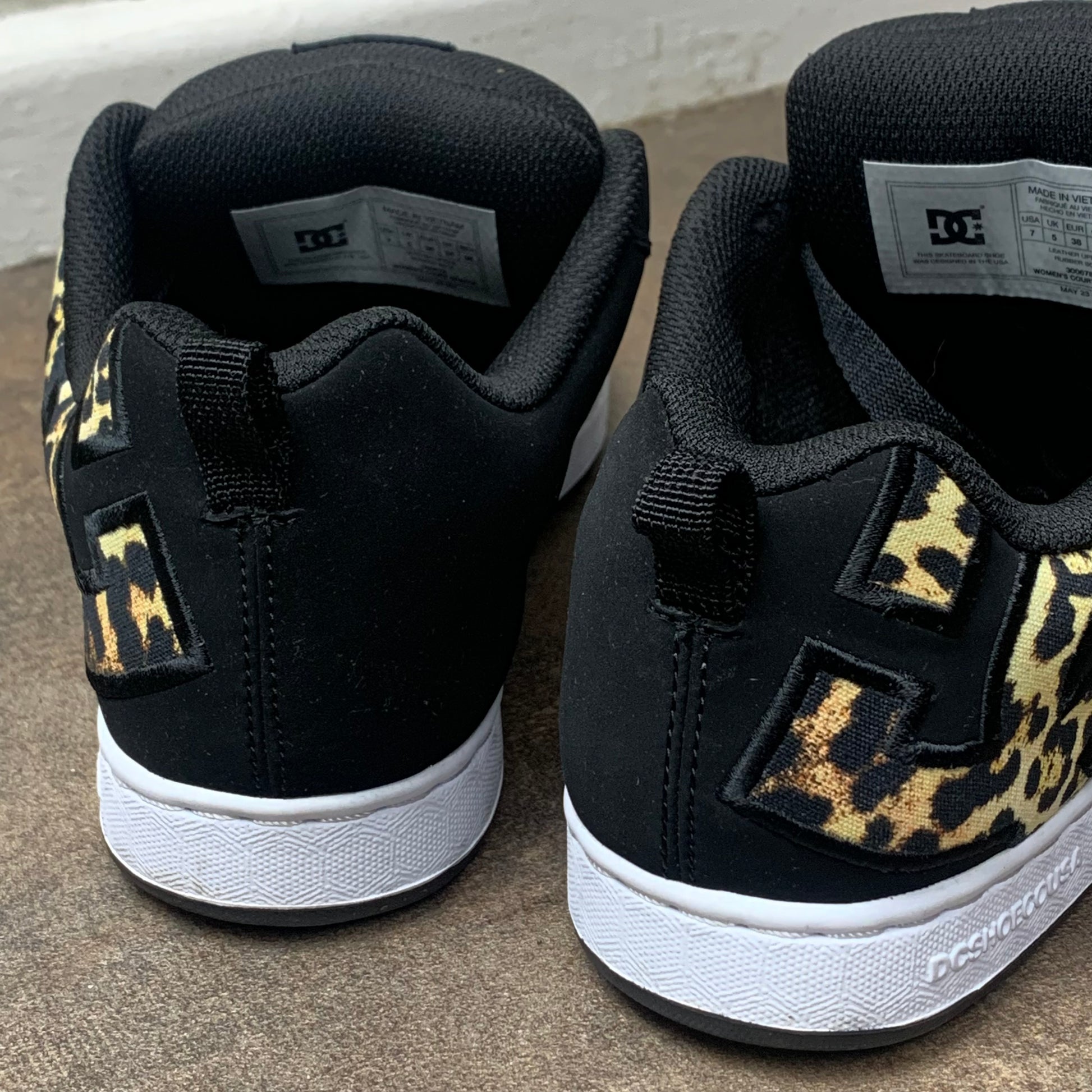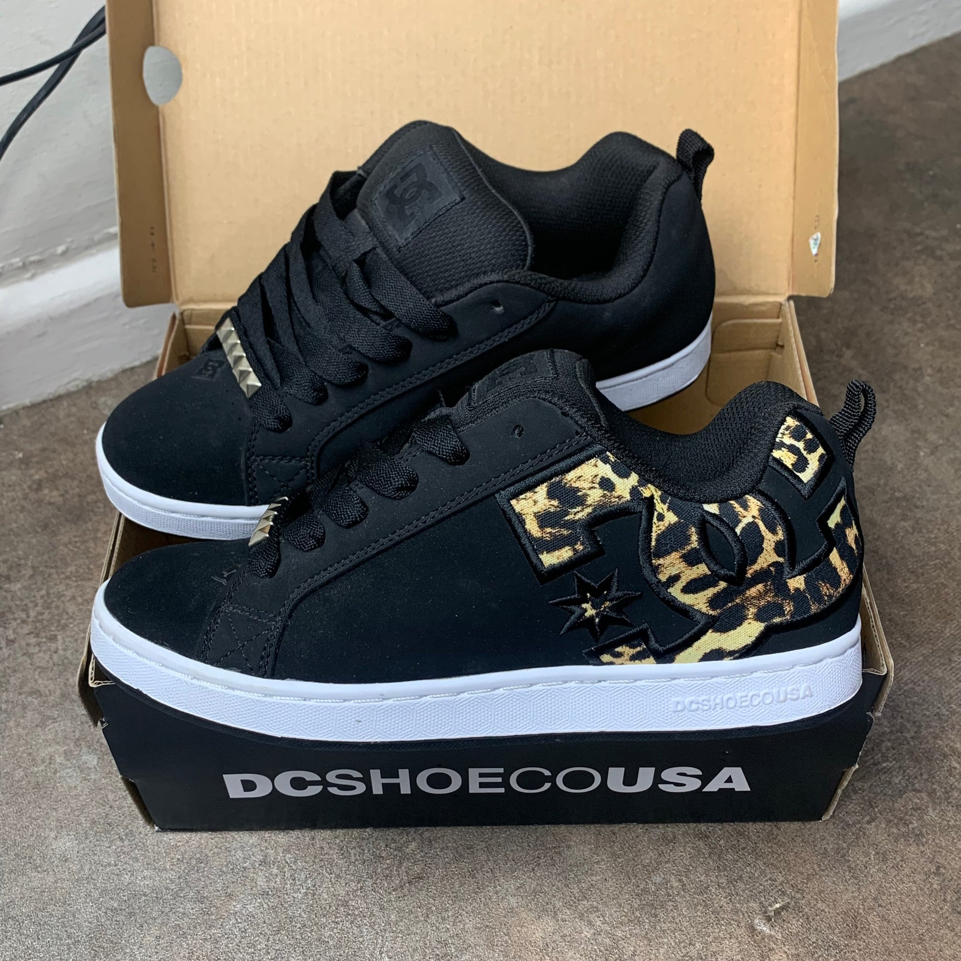 Leopard print big star logos on the outsides of the shoes, coloured black all over, pyramid studs on the bottom laces and like new with box & minimal wear.