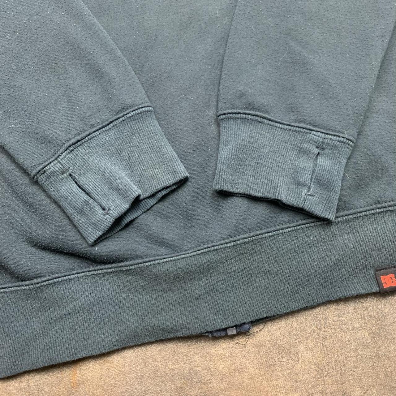 DC Shoes hoodie with a large grey/orange graphic across the front zip, brand detailing on the drawstring tips & the main zip, a branded tab on the back of the waistband, thumb holes in the sleeves, coloured black all over & in very good second hand condition with minimal wear.