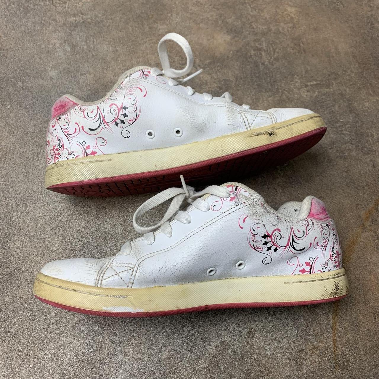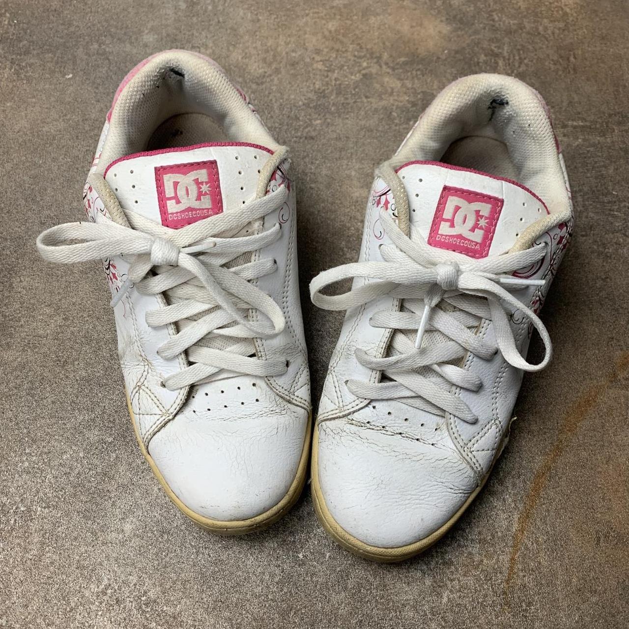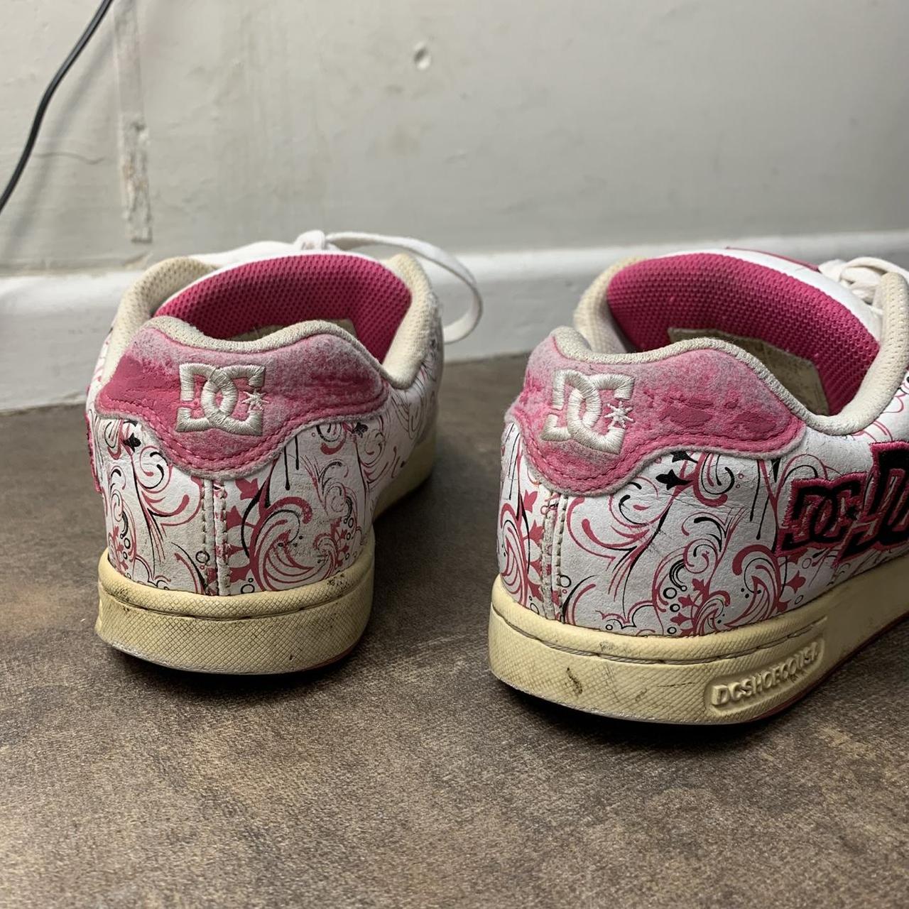 Rare pair of DC Shoes with graphics & embroidered logos in pink/black, pink detailing, the whole shoe coloured white & in good second hand condition with fair wear as shown.
