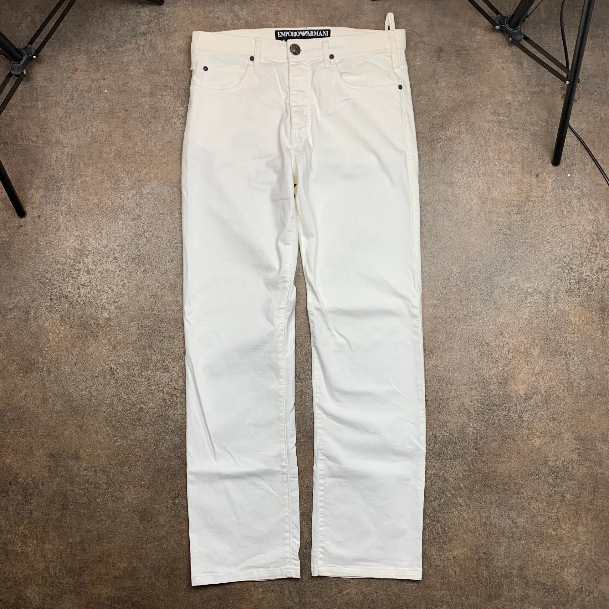 Armani Executive Program trousers with a metallic logo on the back right pocket & jacron, coloured white all over & in great second hand condition with a small yellow stain at the bottom of the right leg as shown.