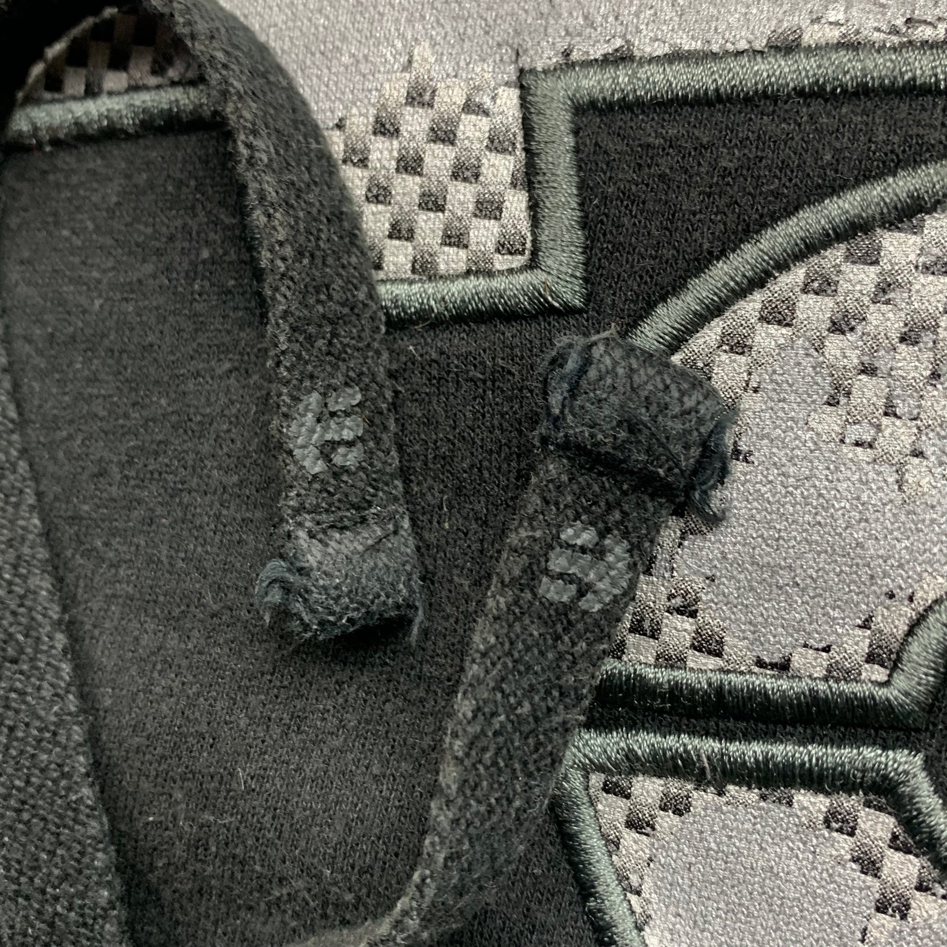 Vintage Etnies hoodie with a large embroidered graphic on the front in grey / white, coloured black all over, in a boxy / wide fit and in ok second hand condition with stains as shown.