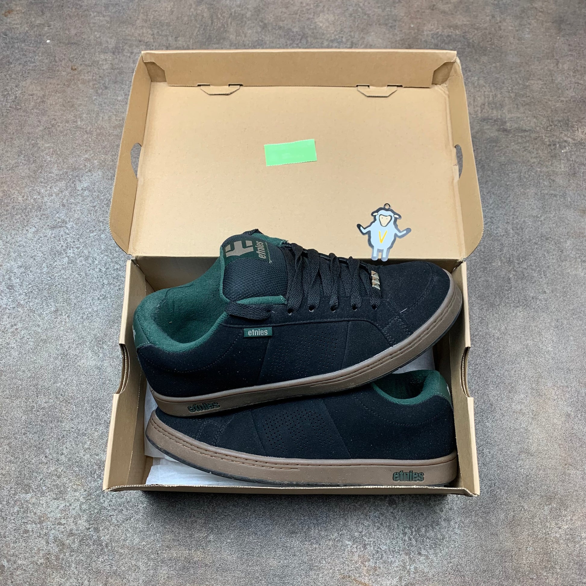 Etnies Kingpin shoes brand new in the box with studs on the bottom laces, logos all over, coloured black with green accents / brown sole and in excellent second hand condition with original box / little to no wear, like new.
