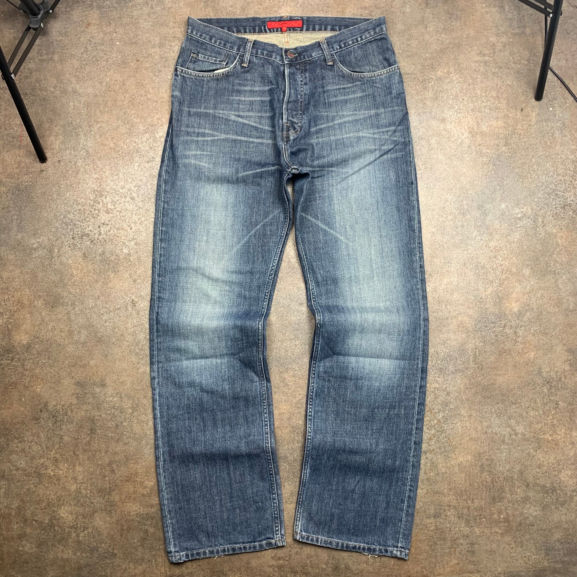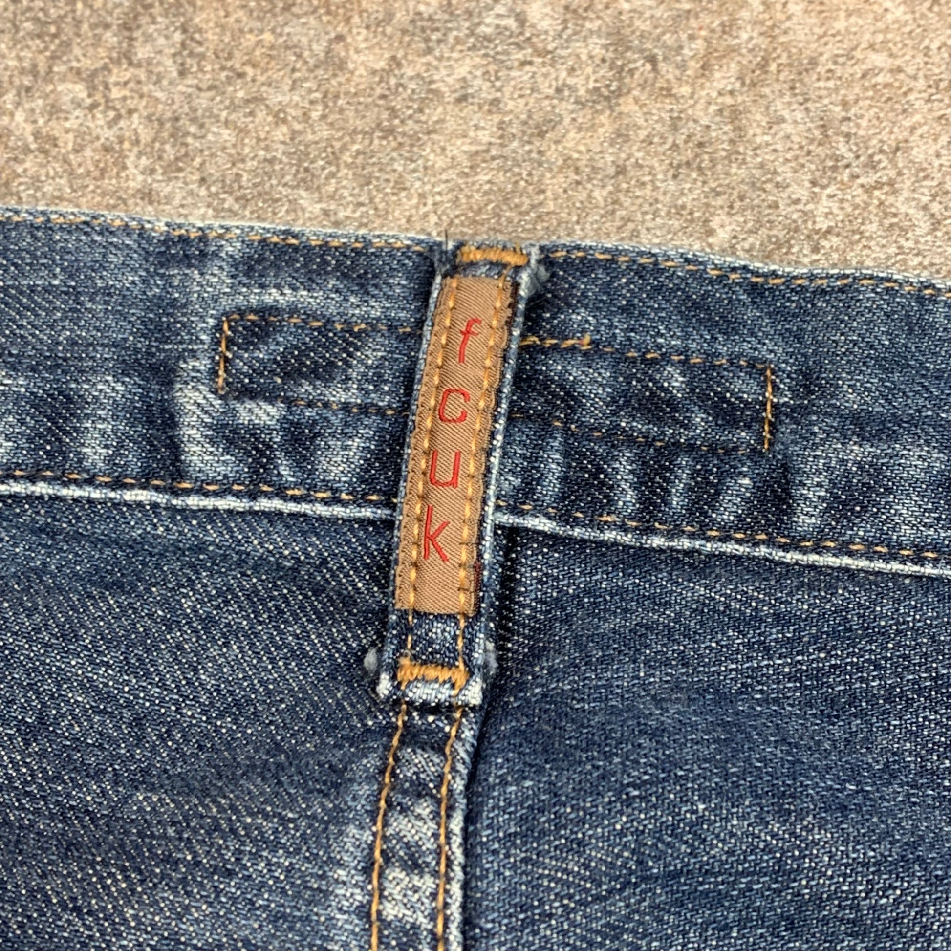 Vintage fcuk jeans with an embroidered graphic on the back right pocket, logo on the back belt loop, coloured washed navy & in excellent second hand condition with minimal heeldrag.