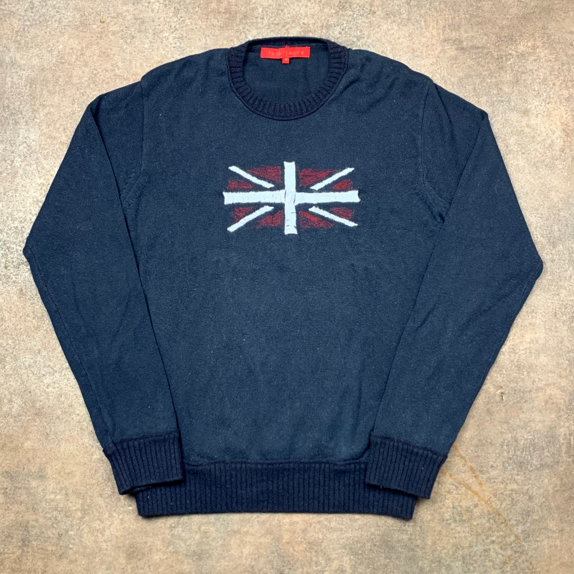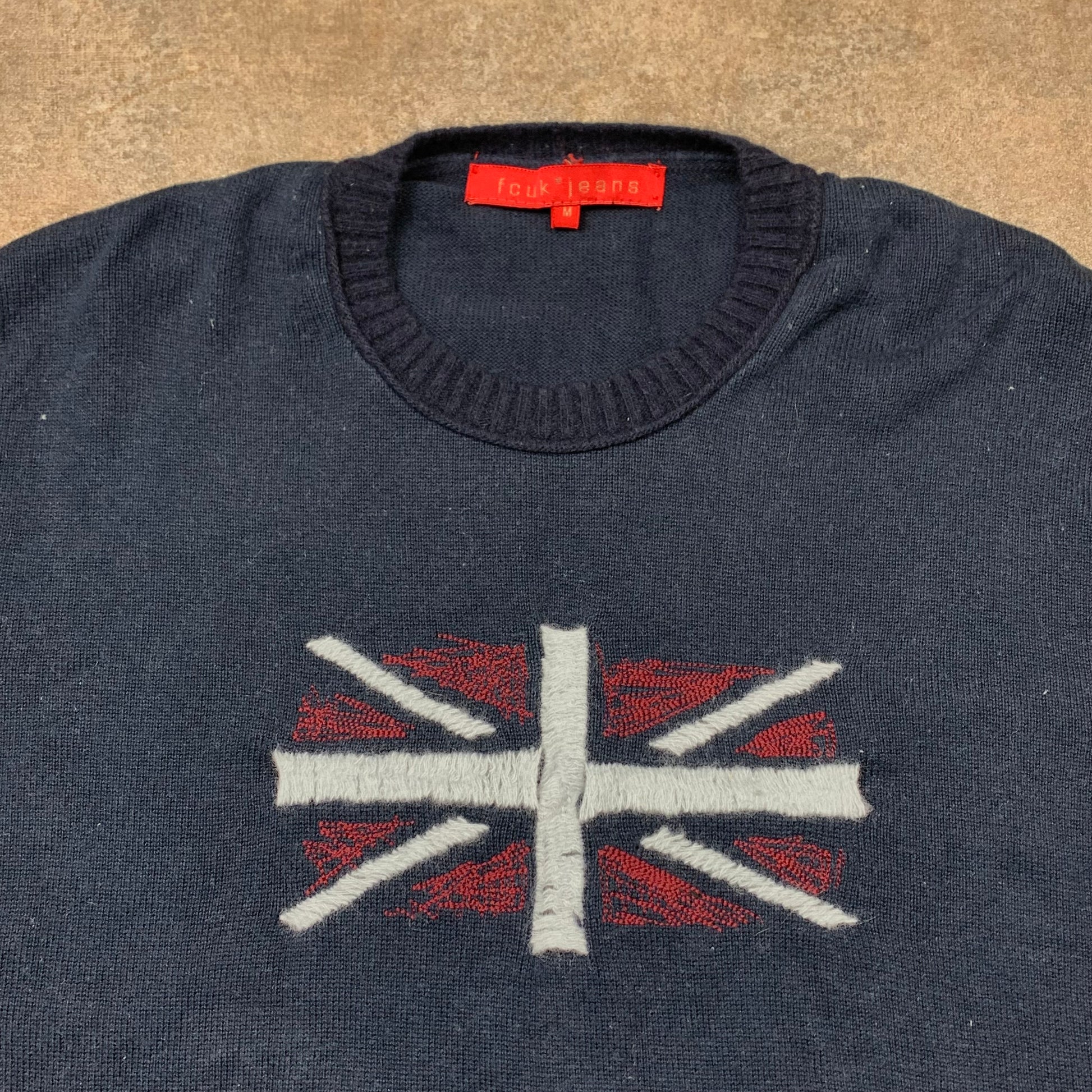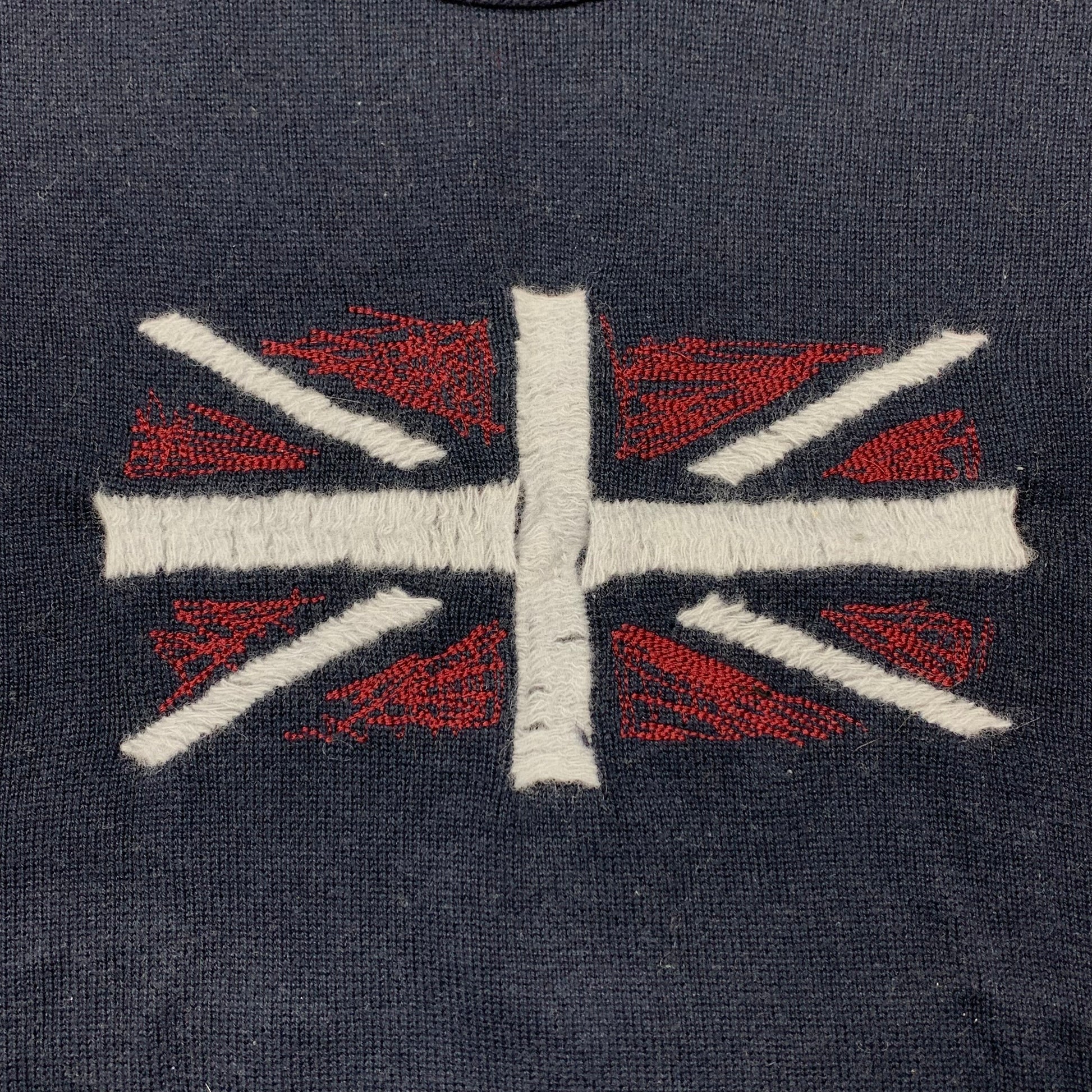 Vintage French Connection knit with a UK flag graphic embroidered on the front, coloured navy all over, warm knit fabric and in excellent second hand condition with minimal wear.