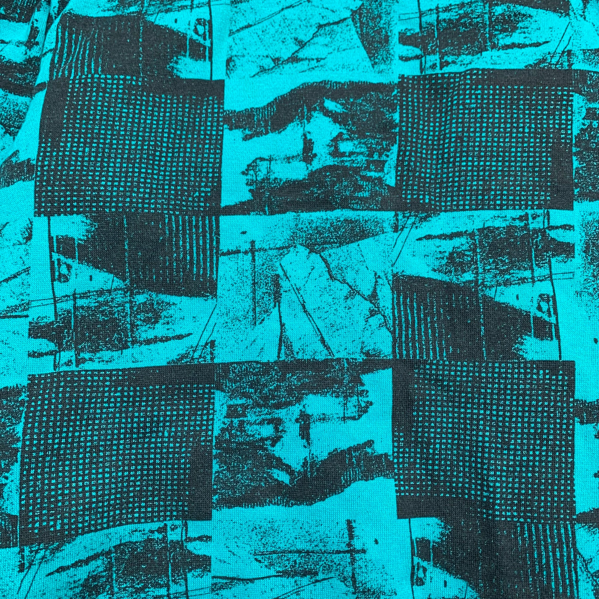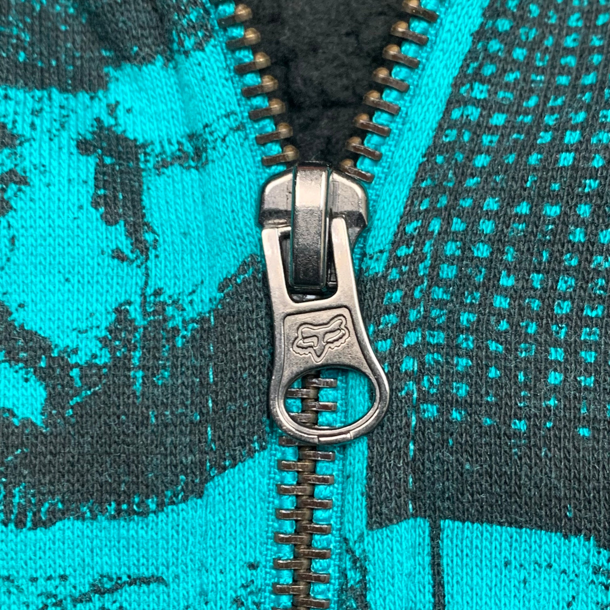 Vintage Fox Riders hoodie with fur lining throughout the torso, repeated pattern all over in blue/grey, white printed logo graphics front and back and in excellent second hand condition with some discolouring to the cuffs, barely noticeable.