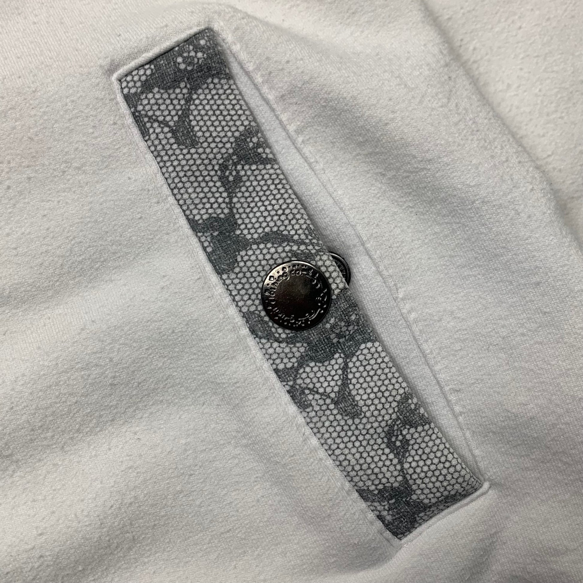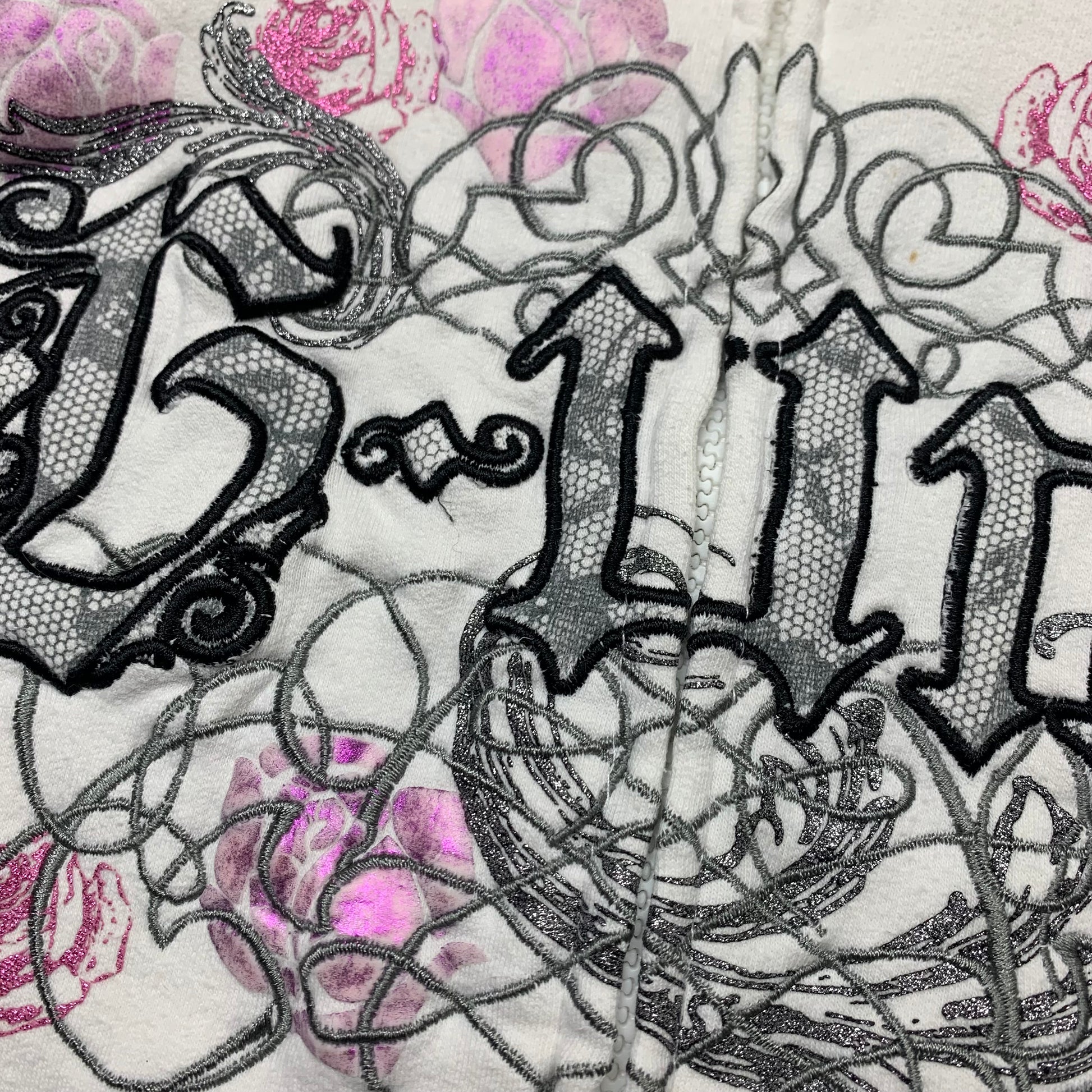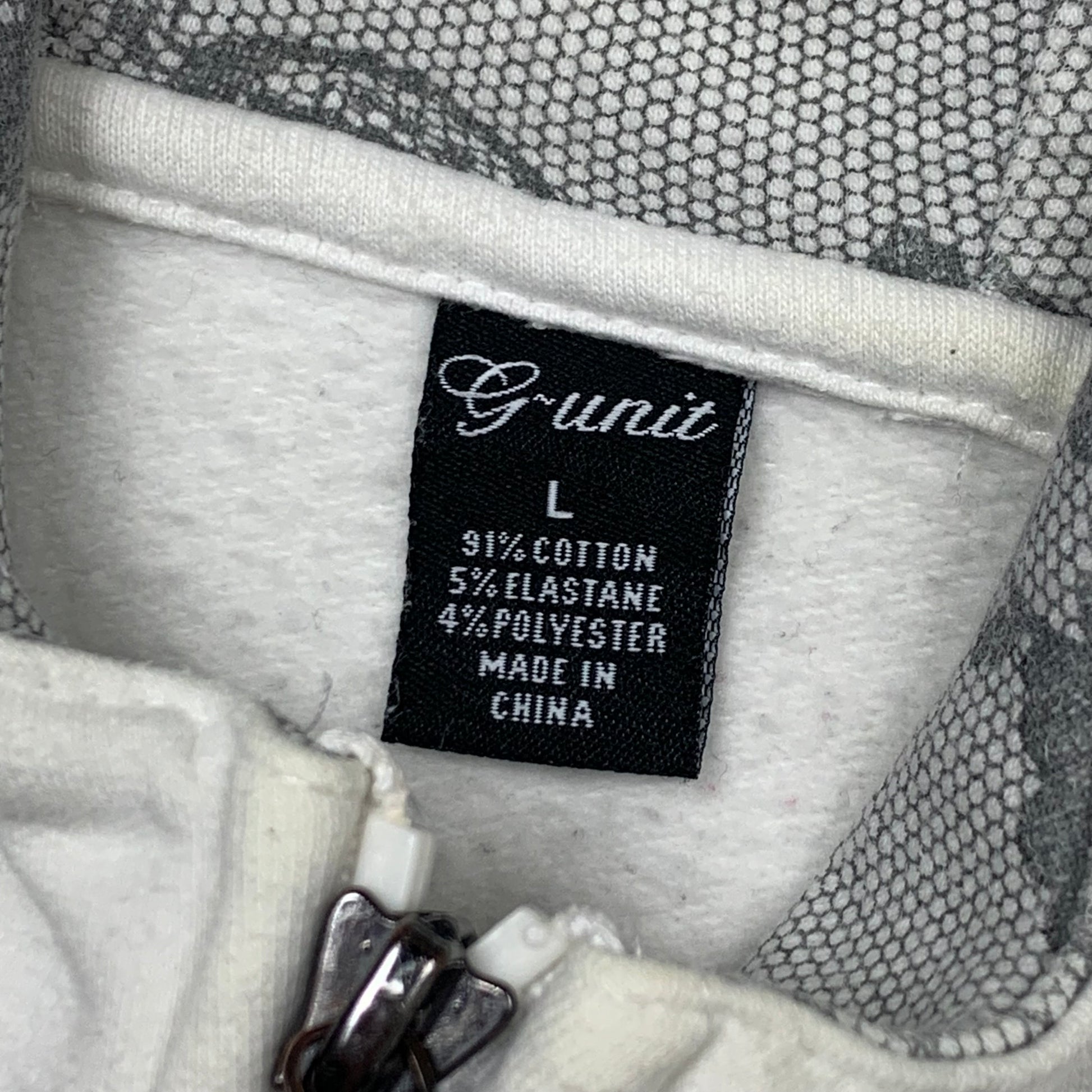 Vintage G-Unit hoodie with an embroidered / printed graphic on the front, coloured white all over with grey / pink detailing, rhinestone detailed zip and in good second hand condition with 2 stains on the front as shown.