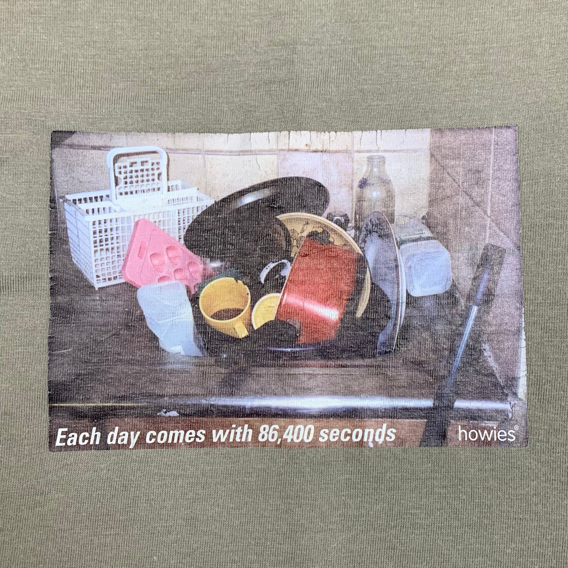 Vintage howies tee with a washing up graphic on the front, coloured faded cream all over & in excellent second hand condition aside from fading (including to tag).