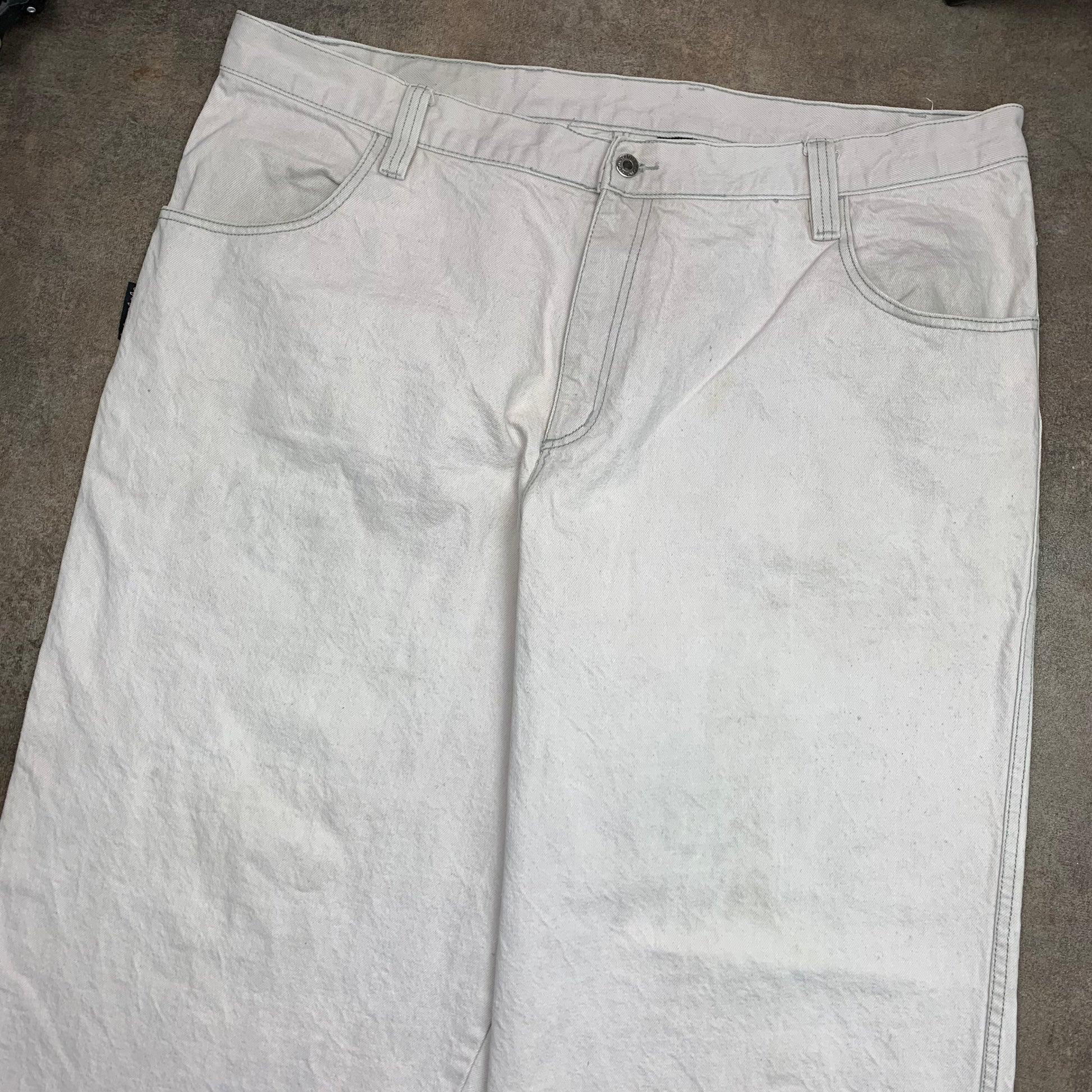 Rare Interstate jeans with an embroidered logo on the back right pocket, logo detailed jacron, branded tab at the top of the right leg, in a baggy / wide leg fit, coloured cream all over and in great second hand condition with marks / wear as shown.