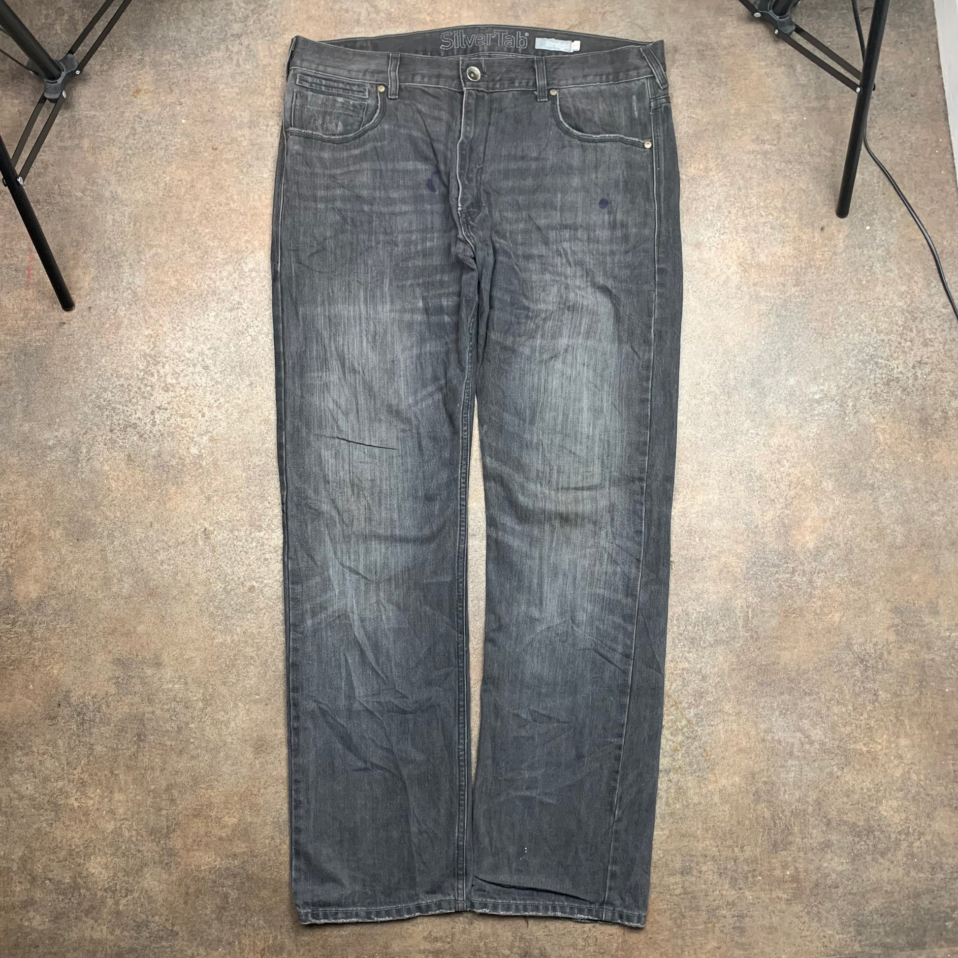 Grunge style pair of Silvertab jeans in a washed black / grey colourway, in a baggy fit, embroidered detailing on the back pockets and branding on the silver tab & belt tab and in good second hand condition with heeldrag / ink stains on the front as shown.