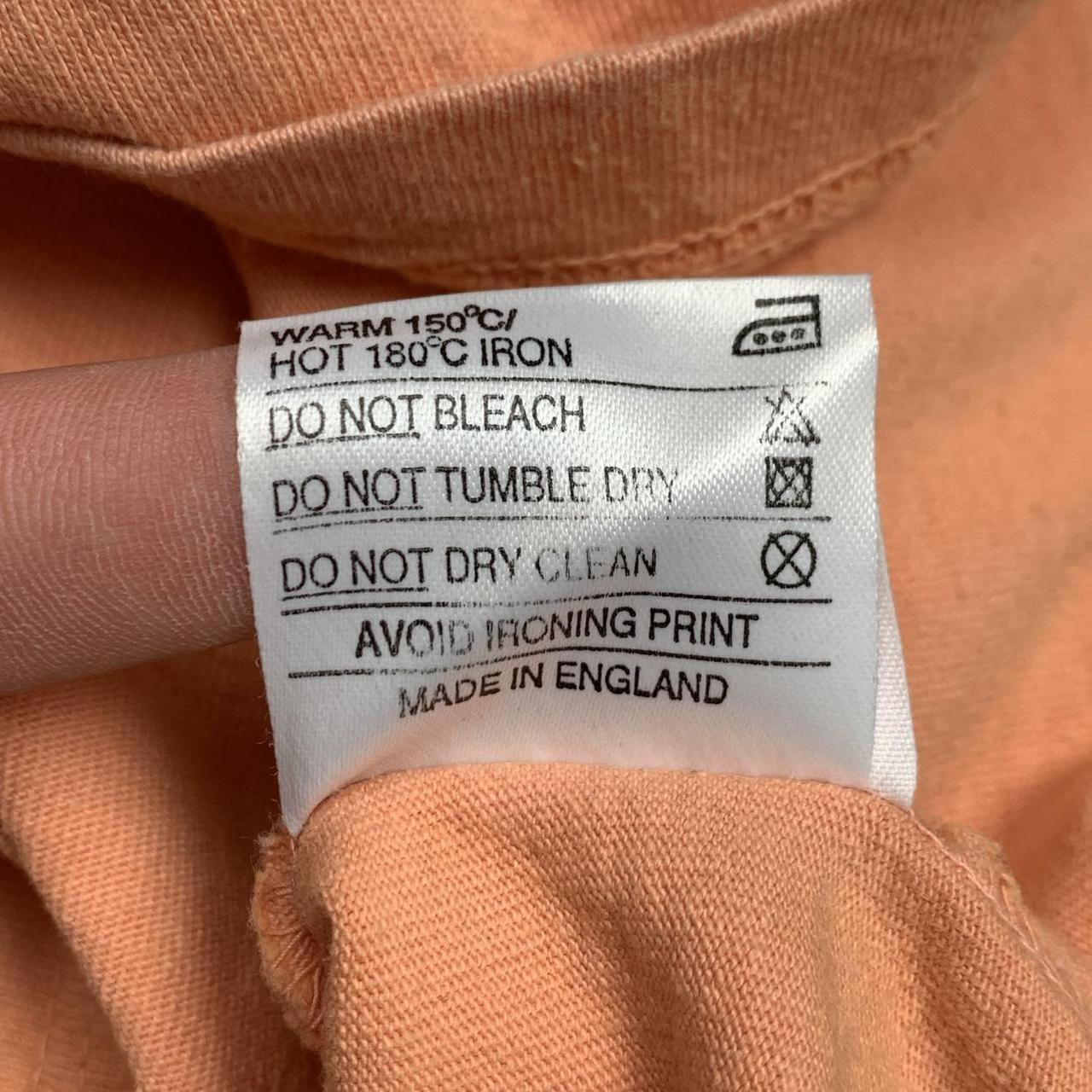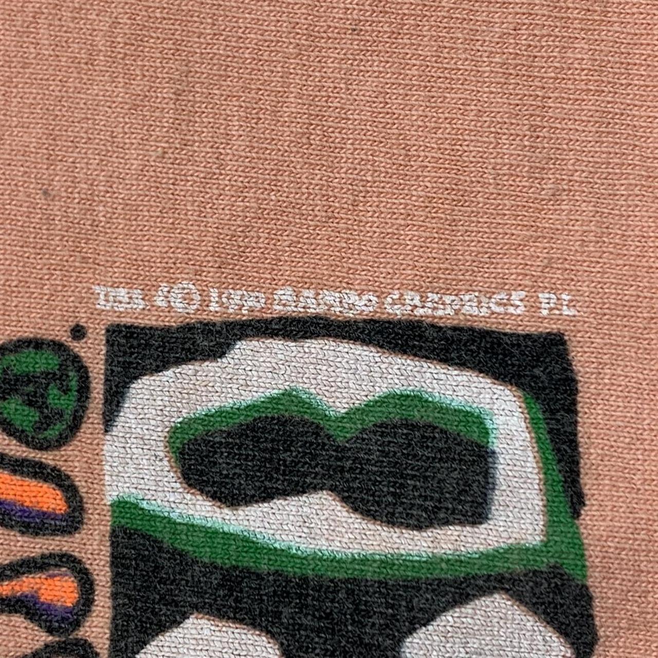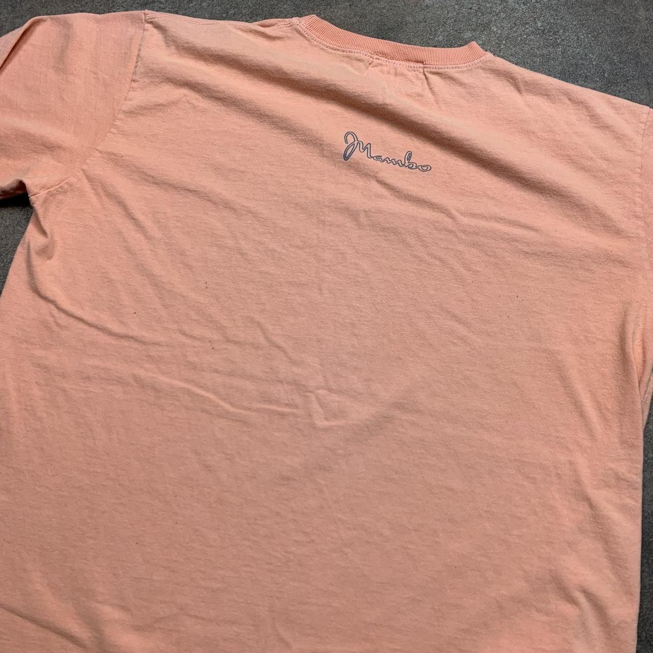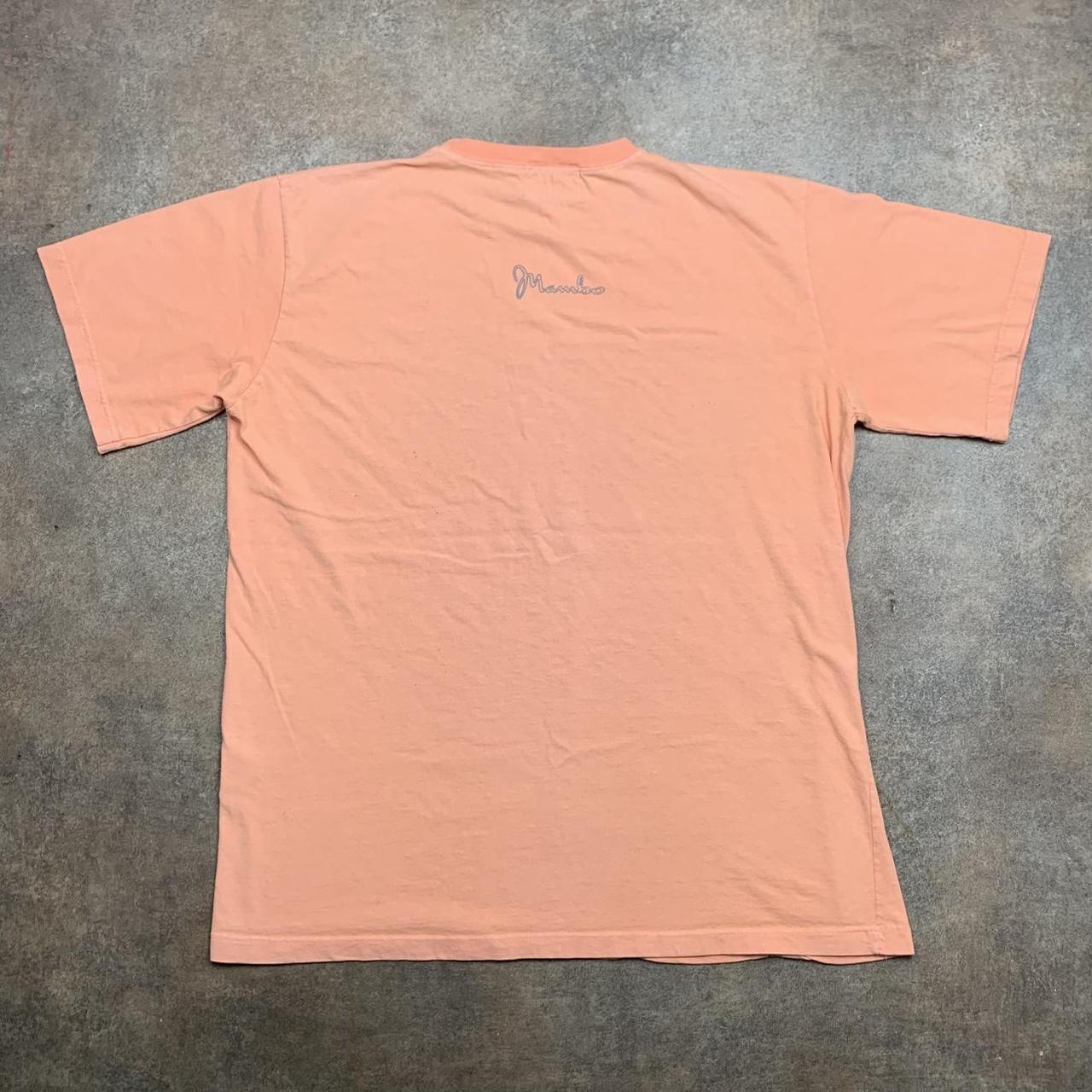 Crazy Mambo tee from 1990 perfect for the summer with graphics front & back, coloured salmon all over with some fading & in very good second hand condition for a top like this with brown spots across the back as shown.