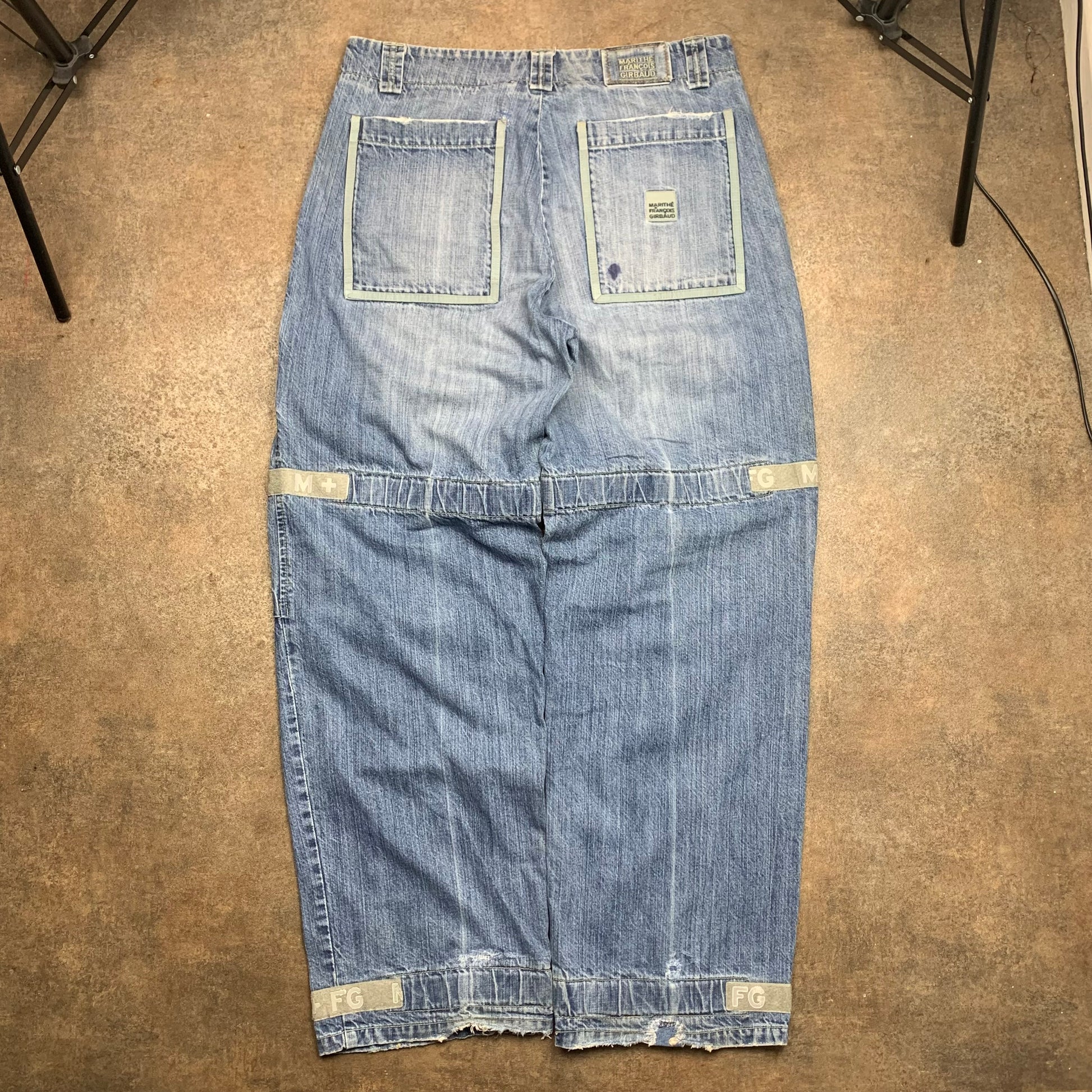 Rare vintage M+FG jeans with grey velcro width adjustment straps, cargo pockets in the front knee panelling, coloured washed blue all over & in great second hand condition with wear / repair as shown.