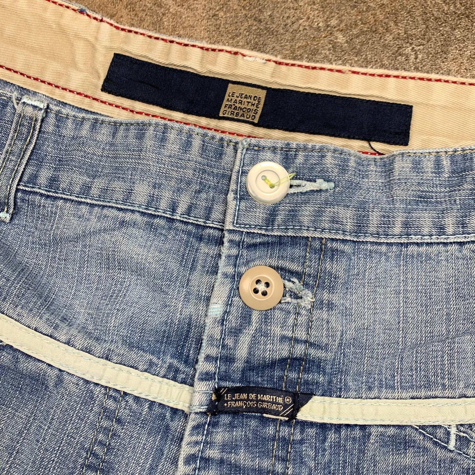 Rare pair of M+FG jeans with white accents, a tall pocket down the left leg, coloured washed light blue & in very good second hand condition with some barely noticeable marks on the front.