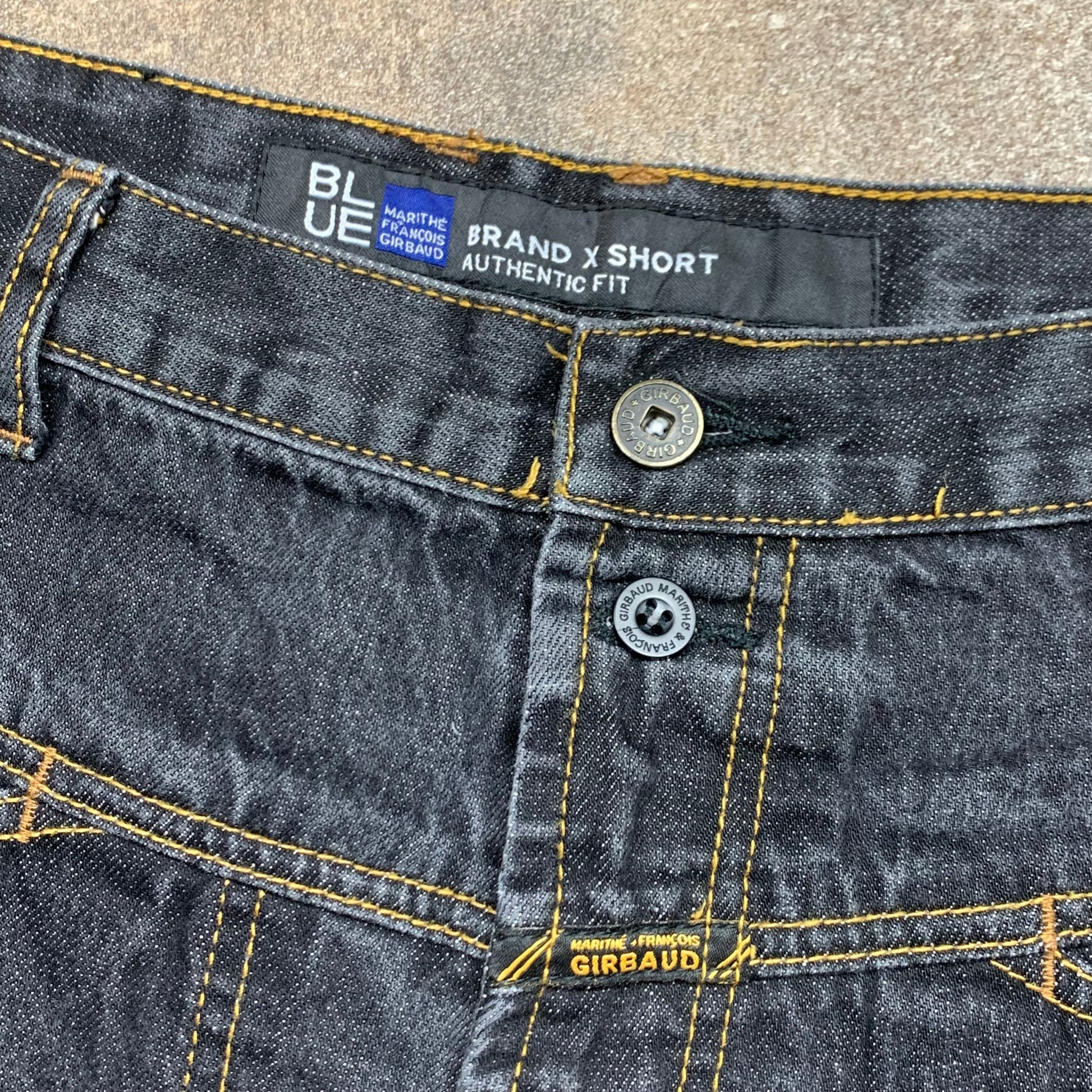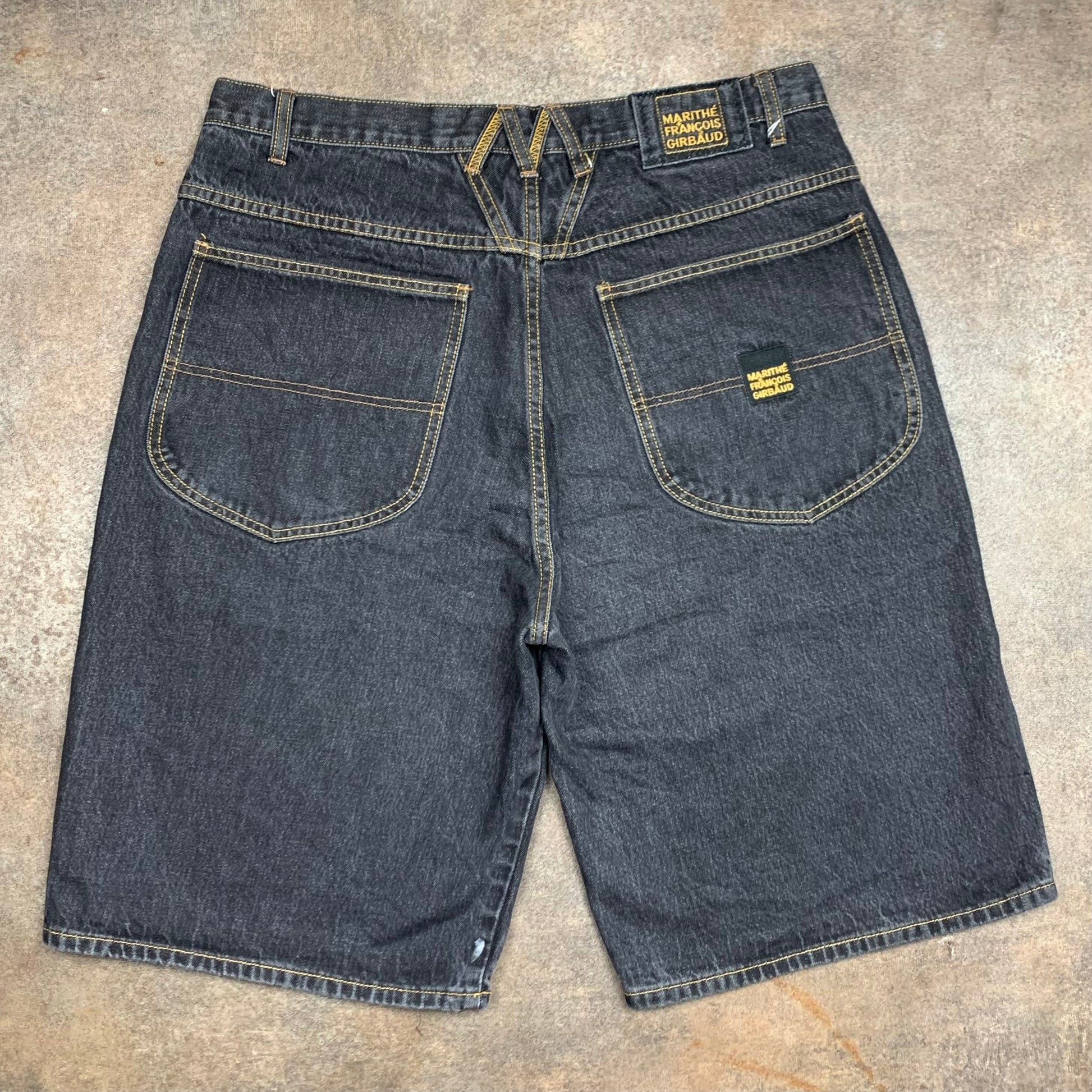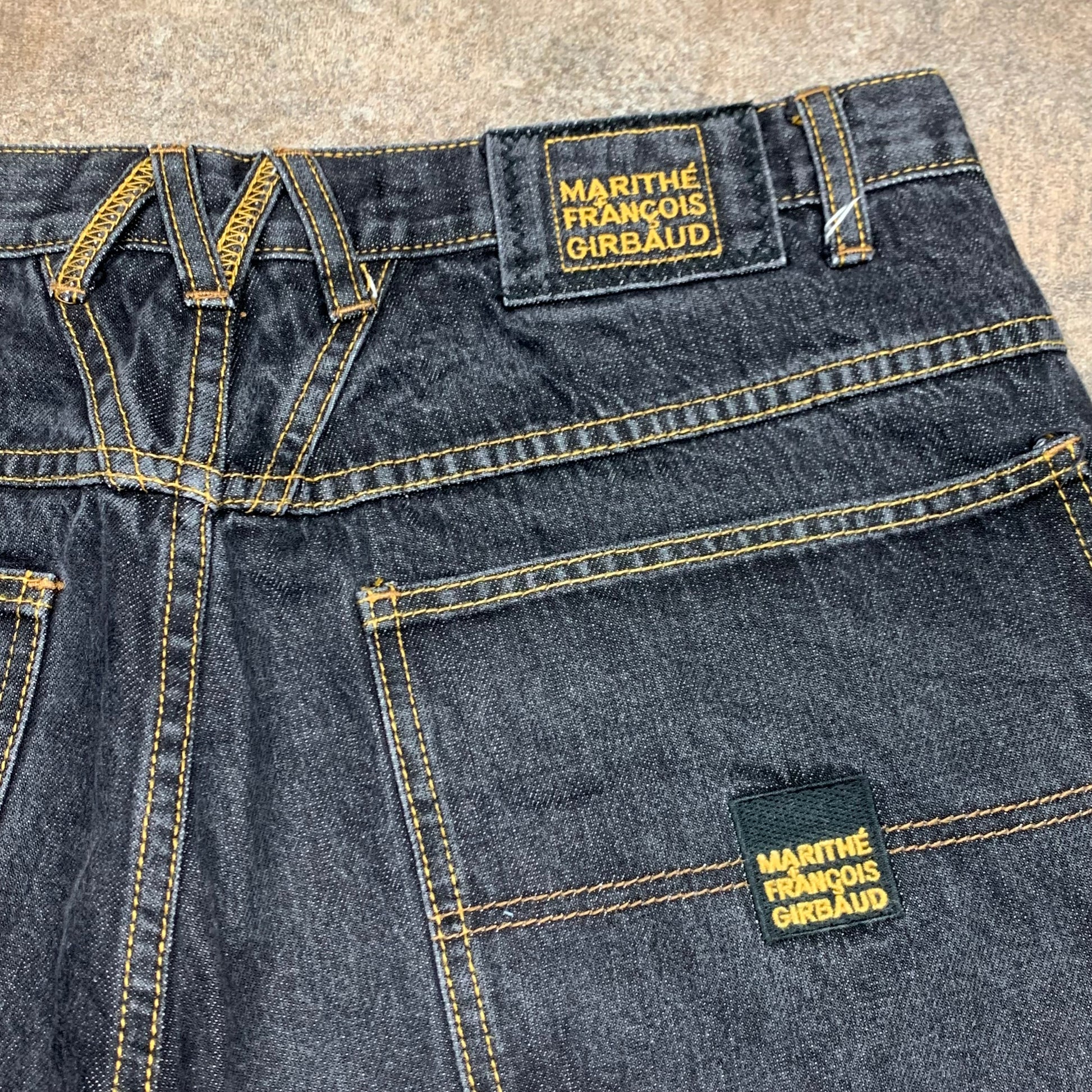 Perfect pair of M+FG jeans coloured black all over with yellow stitching, in a super baggy fit & in very good second hand condition with a barely noticeable repair on the bottom of the left leg.