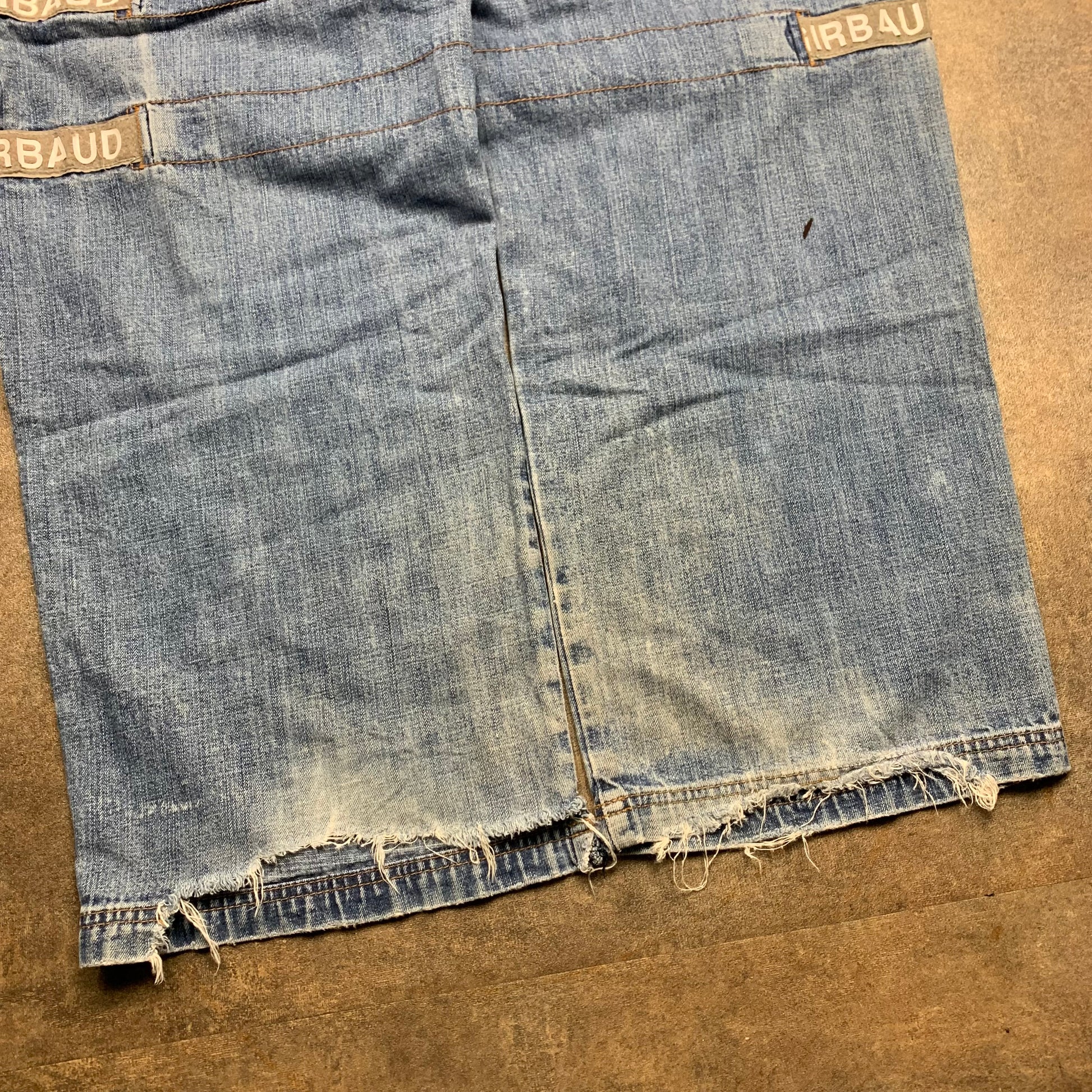 Rare M+FG jeans with grey velcro width adjustment straps, coloured washed blue, in a baggy fit and in good second hand condition with wear as shown.