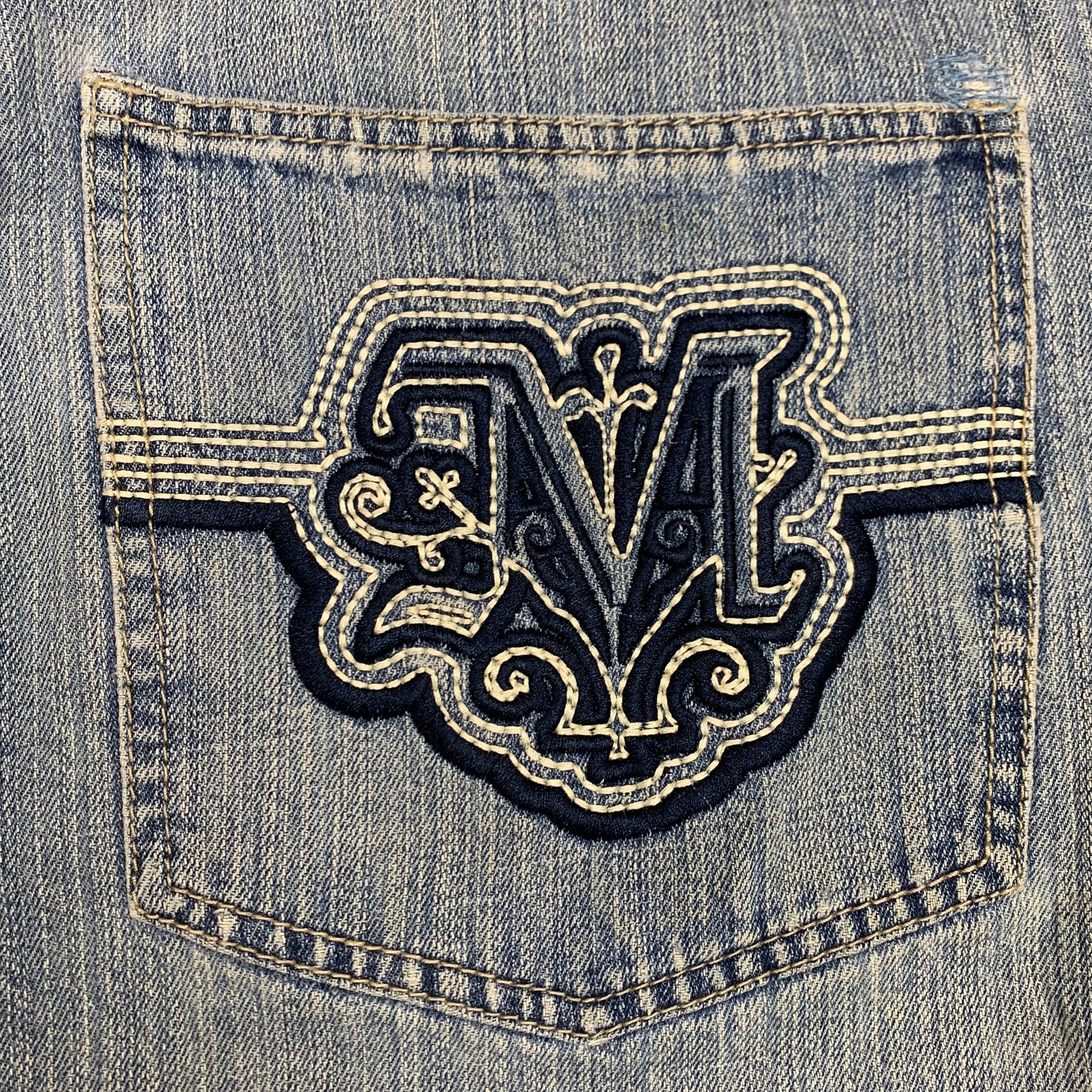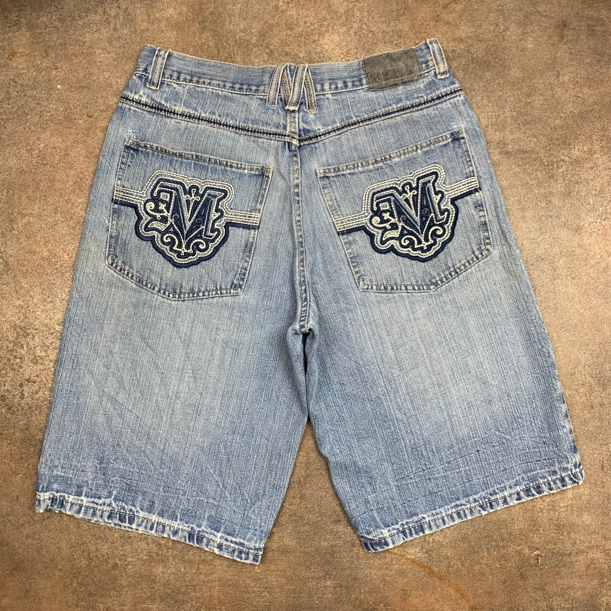 Rare pair of Mecca jorts with large emrboidered graphics on both the back pockets, embroidered branded detailing on top of the front pockets, an M at the top of the back made with belt loops, coloured washed light blue all over & in very good second hand condition with faint marks / repair as shown.