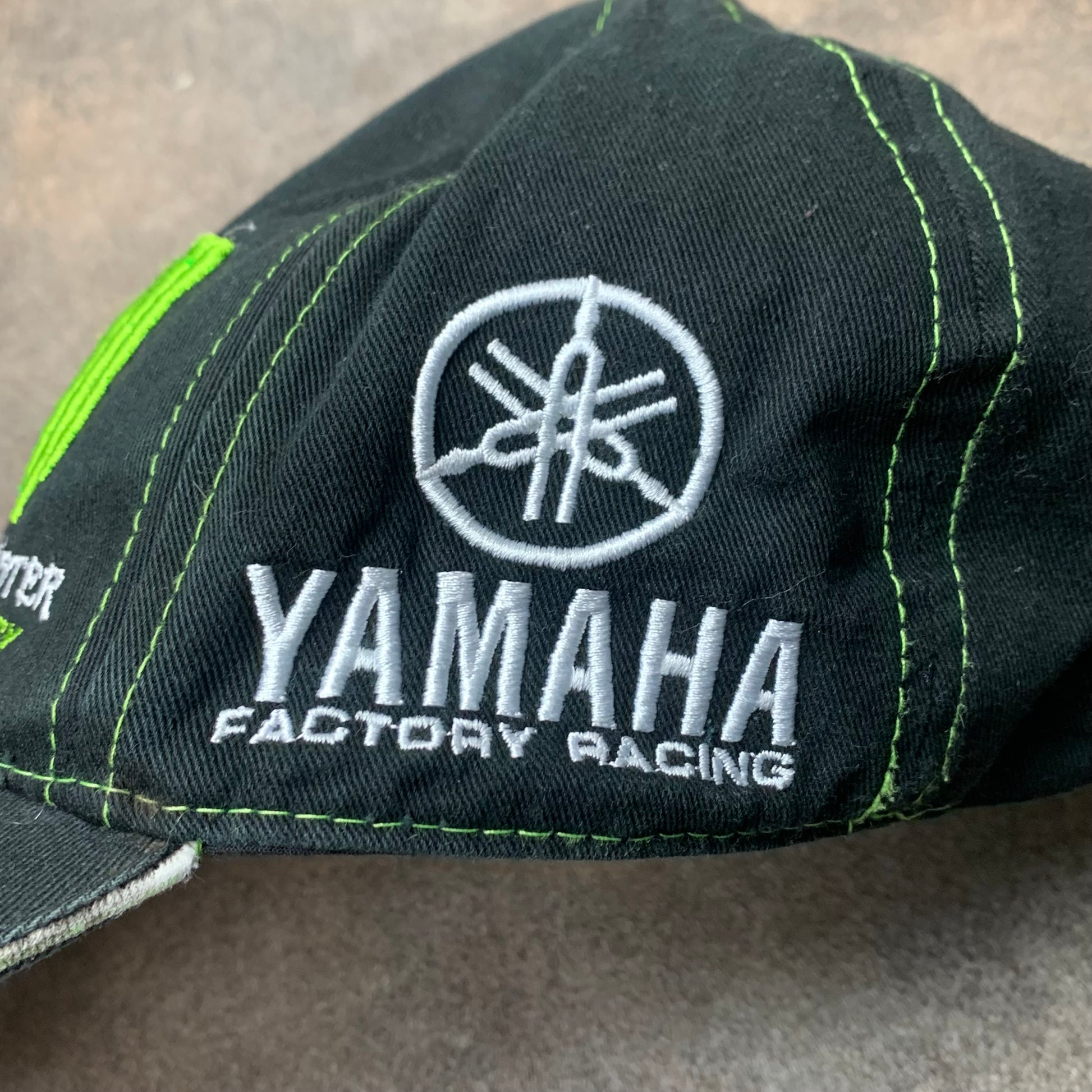 Vintage Monster Energy x Yamaha cap with embroidered graphics on the brim and front panels, printed yamaha logos, coloured black with monster green / white accents and in excellent second hand condition with creasing as shown, easily fixable.