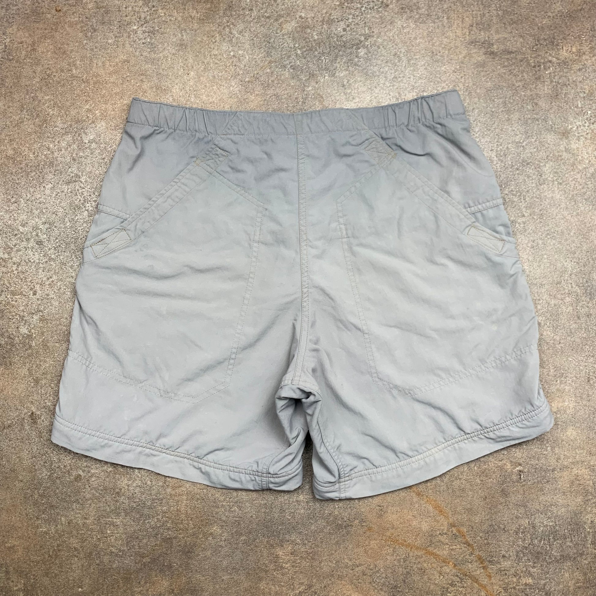 Baggy Mountain Hardwear shorts perfect for the summer with an embroidered logo on the bottom of the left leg, built in belt, coloured grey all over with some fading & in very good second hand condition with some barely noticeable marks.
