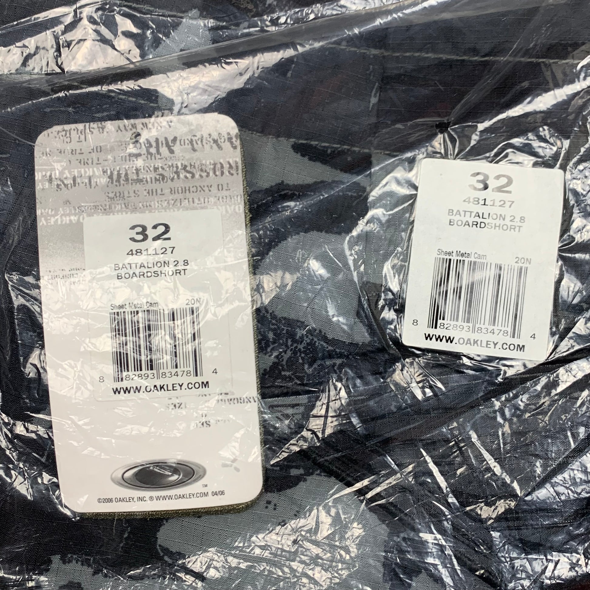 Rare pair of Oakley boardshorts from the military collection brand new with tags, surf wax comb/bottle opener & factory packaging, coloured black/grey in a camo graphic all over and Oakley branding on the cargo pocket / back.