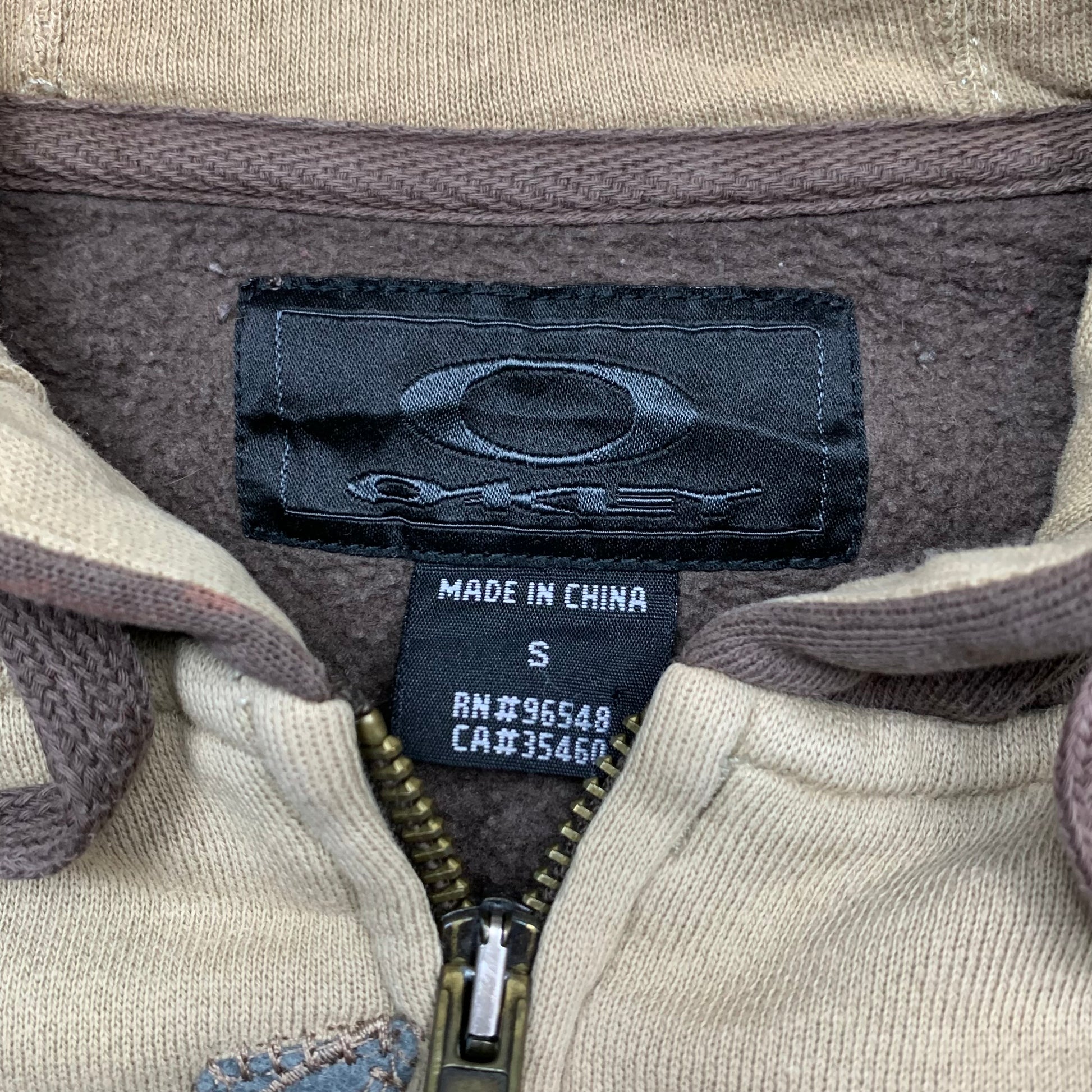 Vintage Oakley hoodie with a cut and sewn graphic across the front zip, coloured brown all over with cream / grey accents and in great second hand condition with a barely noticeable mark to the hood as shown in the final photo.