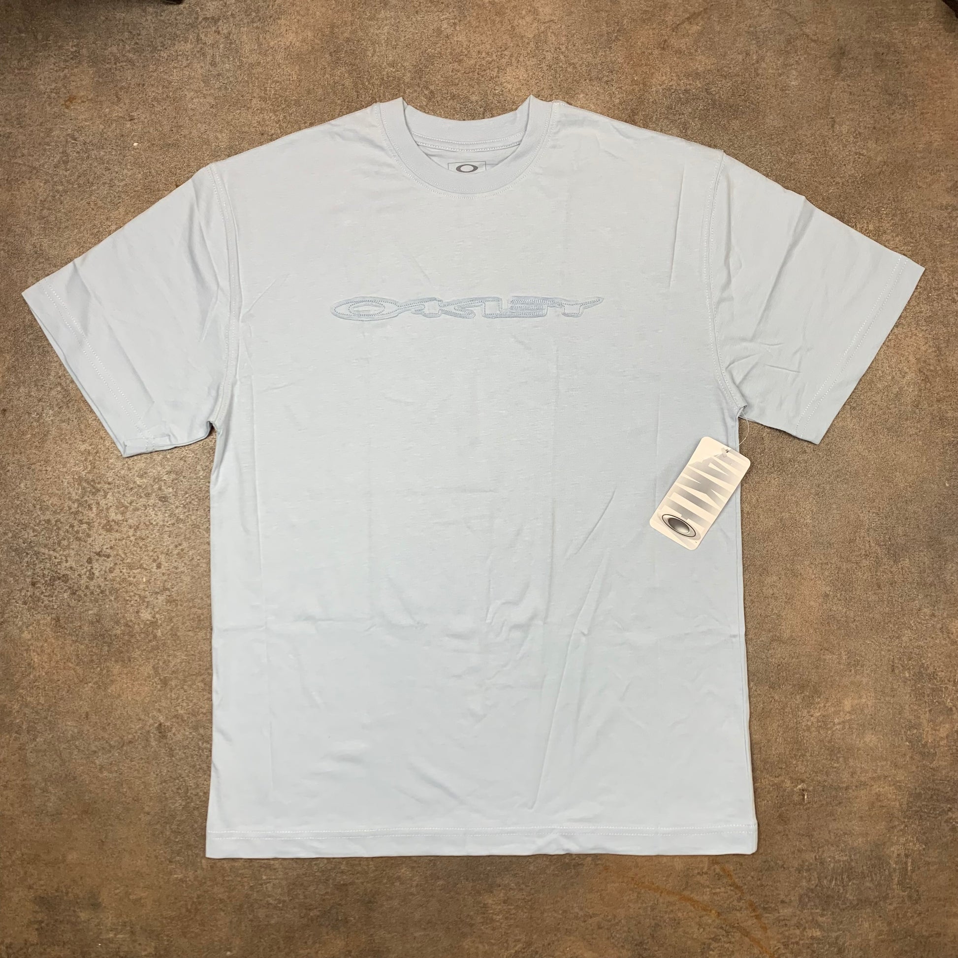 Vintage Oakley tee with a cut and sewn graphic on the front, coloured baby blue all over and brand new with tags.