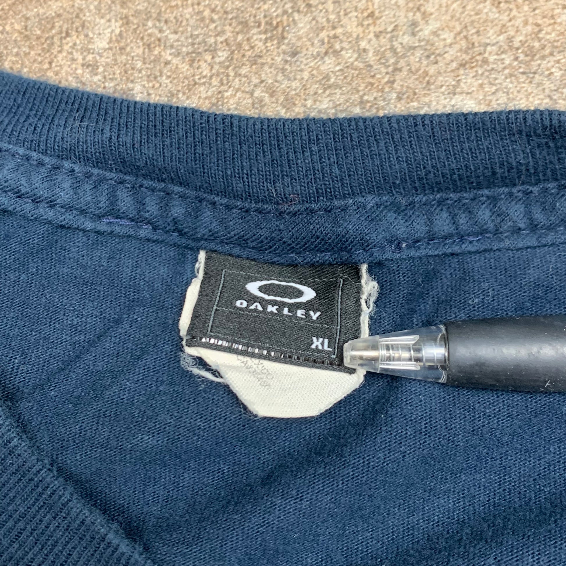 Rare Oakley tee with blue logo graphics back & front, coloured navy all over & in very good second hand condition with some barely noticeable marks to the sleeve.