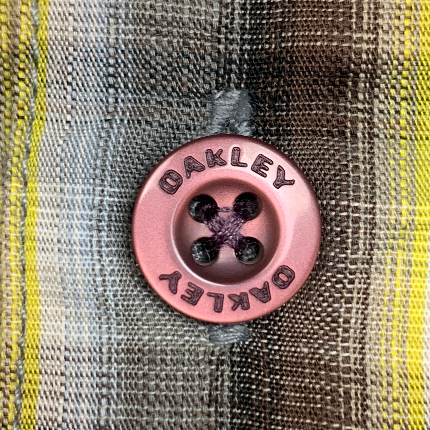 Rare 2000s Oakley shirt with an all over white/yellow/brown plaid print, shoulder epaulettes, a pocket on the front, branded buttons & brand new with tags.