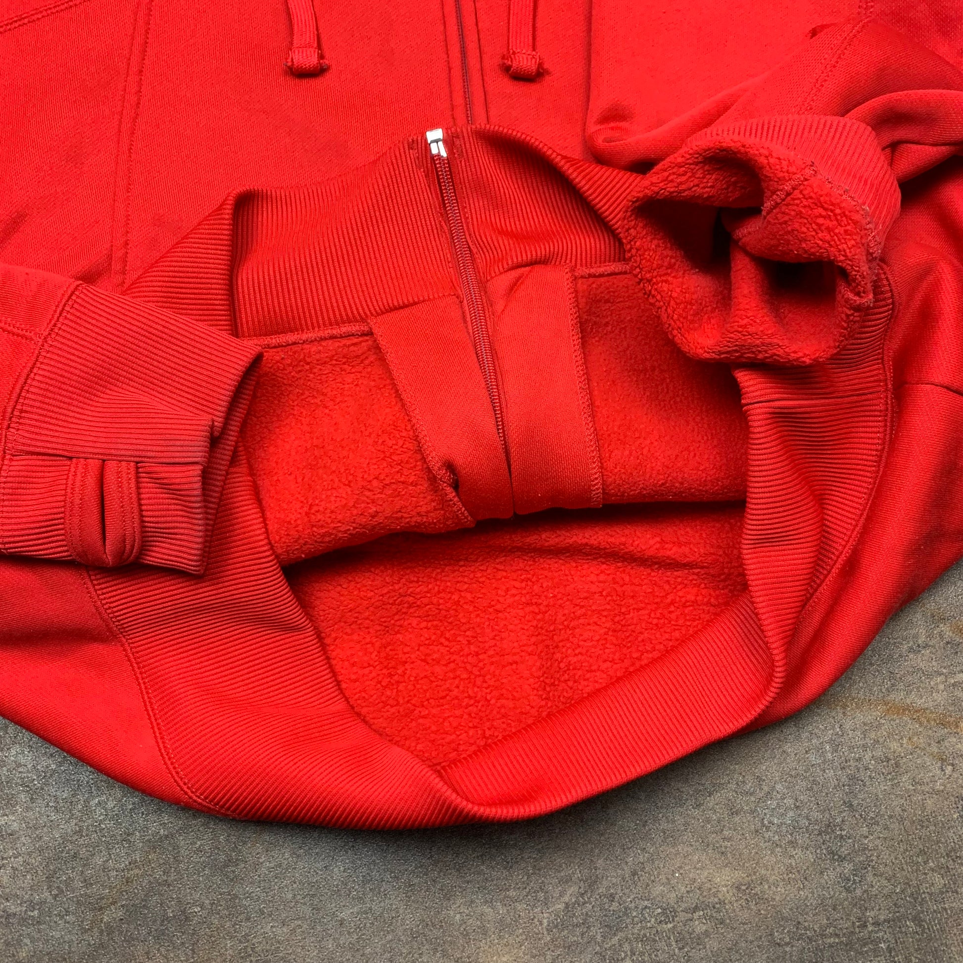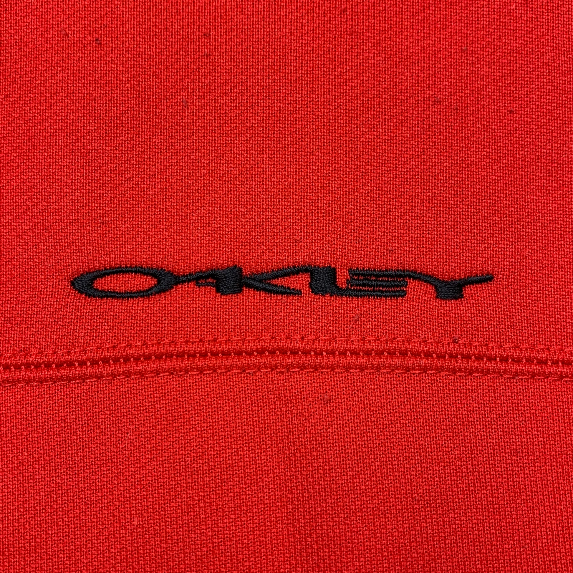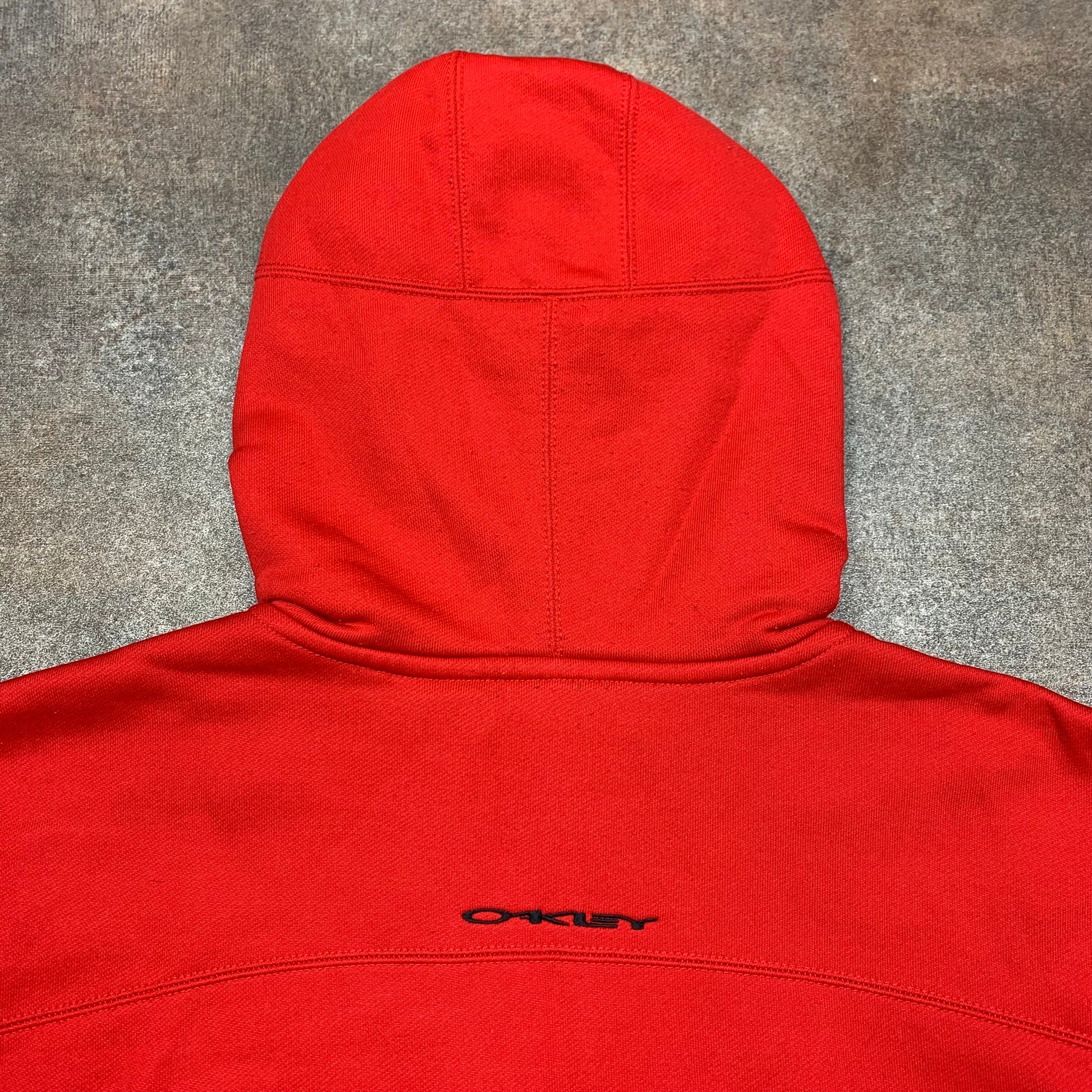 Vintage Oakley hoodie coloured red all over with black logo graphics front and back, in a boxy fit, thumb holes in the sleeves, zip pockets and in excellent second hand condition with little to no wear.