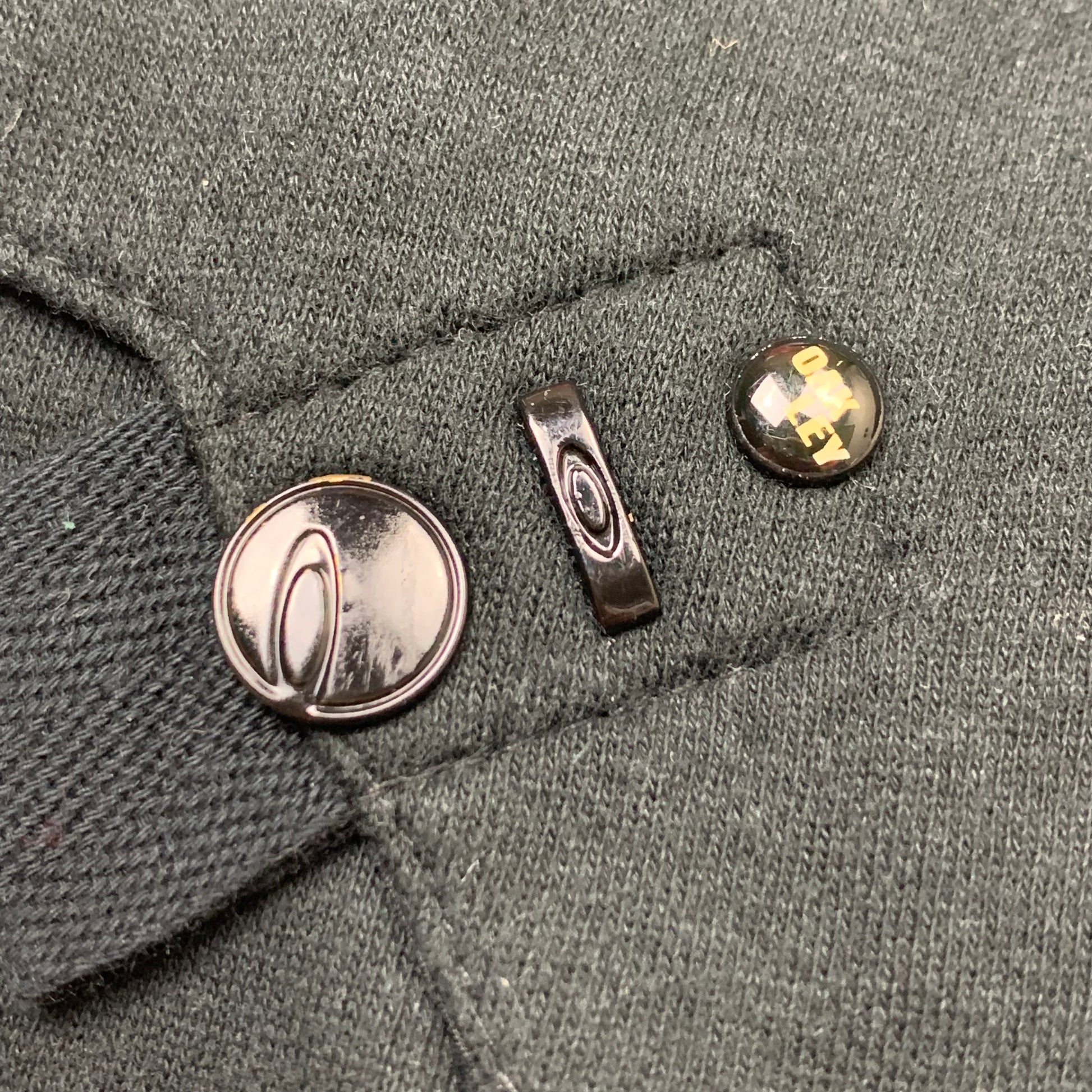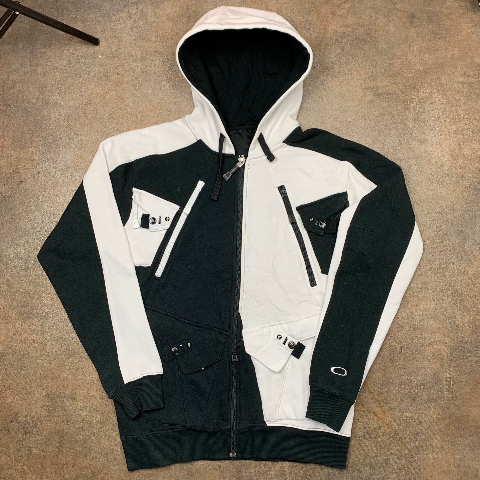 Rare vintage Oakley hoodie with embroidered O logos on the left sleeve and top of the back, coloured black / white all over, detailed zips / hardware and in great second hand condition with a mark on the front as shown.