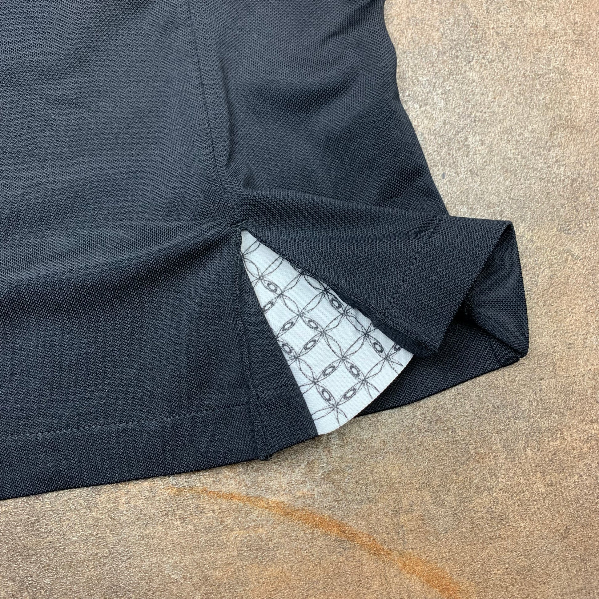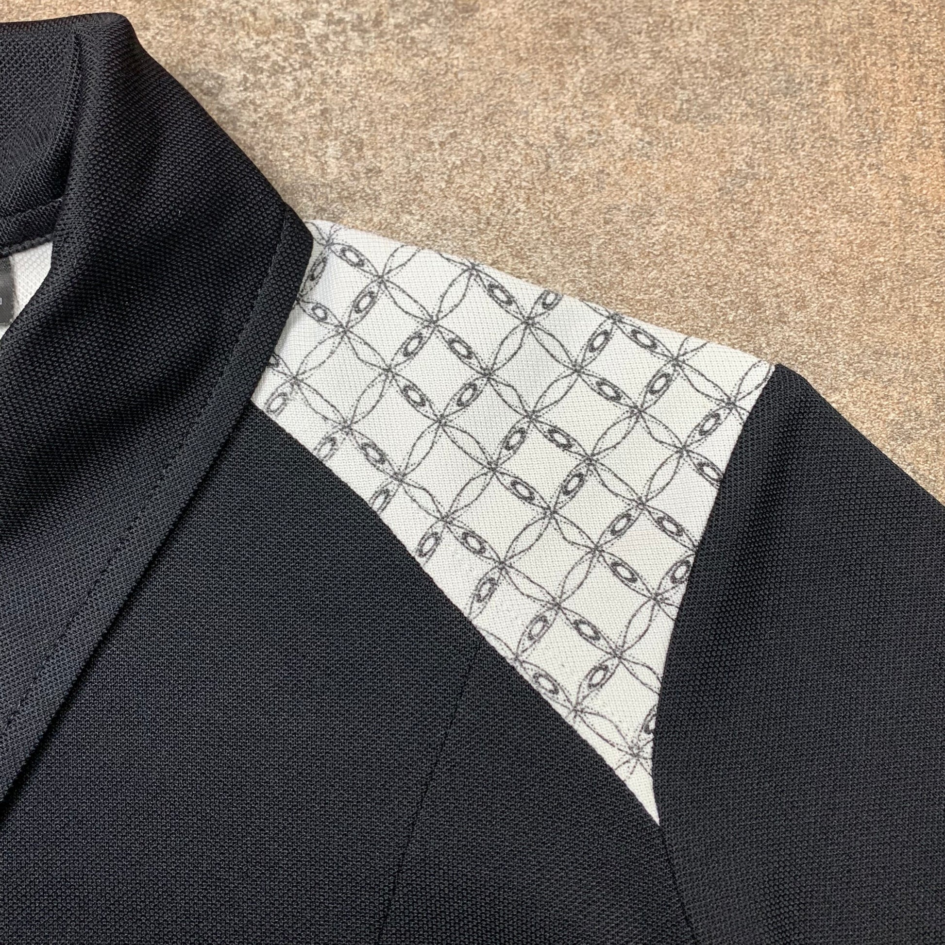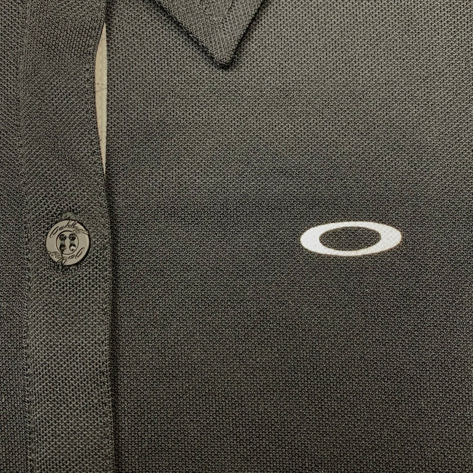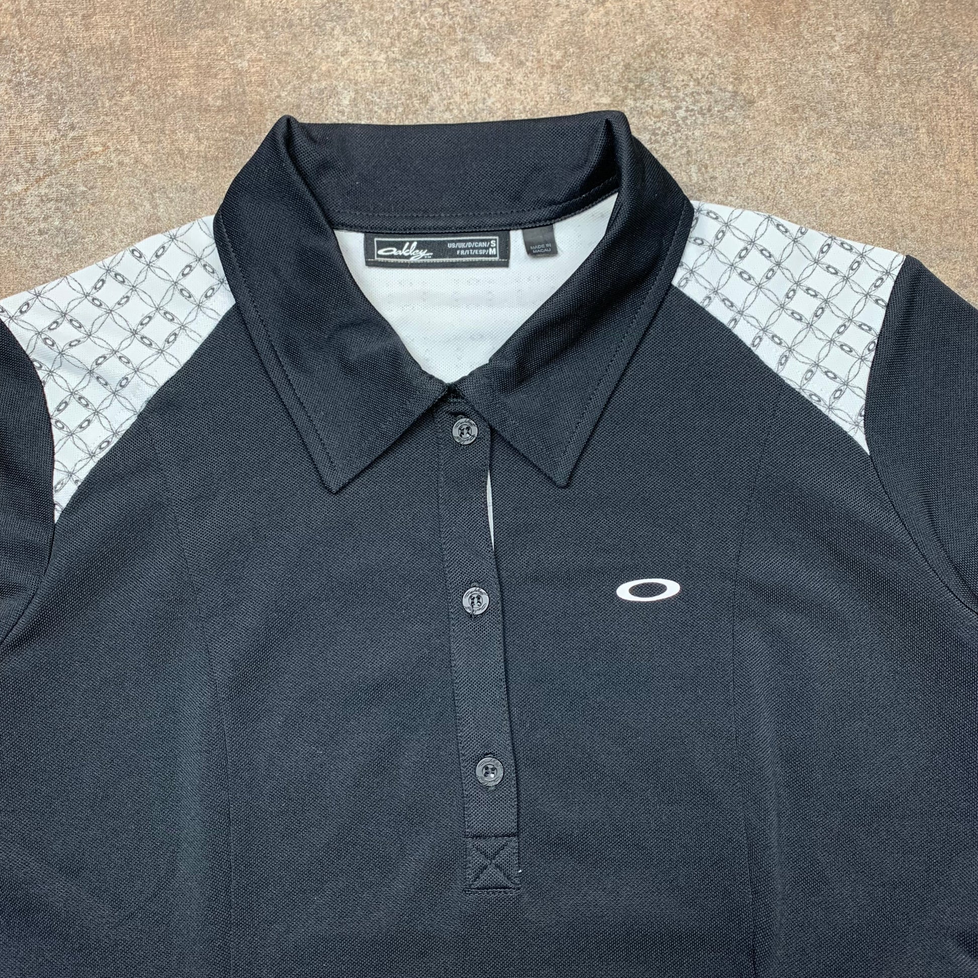 Vintage Oakley shirt with a repeated Oakley pattern detailed on the panel around the top / in the pleats, coloured black with white accents, printed O logos on the front and back and in excellent second hand condition with little to no wear.