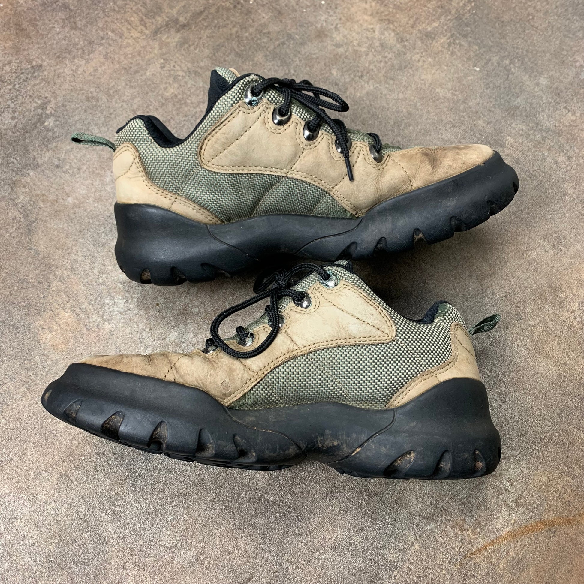 Rare Oakley shoes with metal icon logos on the outsides of both shoes, coloured cream / green with black detailing, skull logo on the tongue and in good second hand condition with wear as shown.