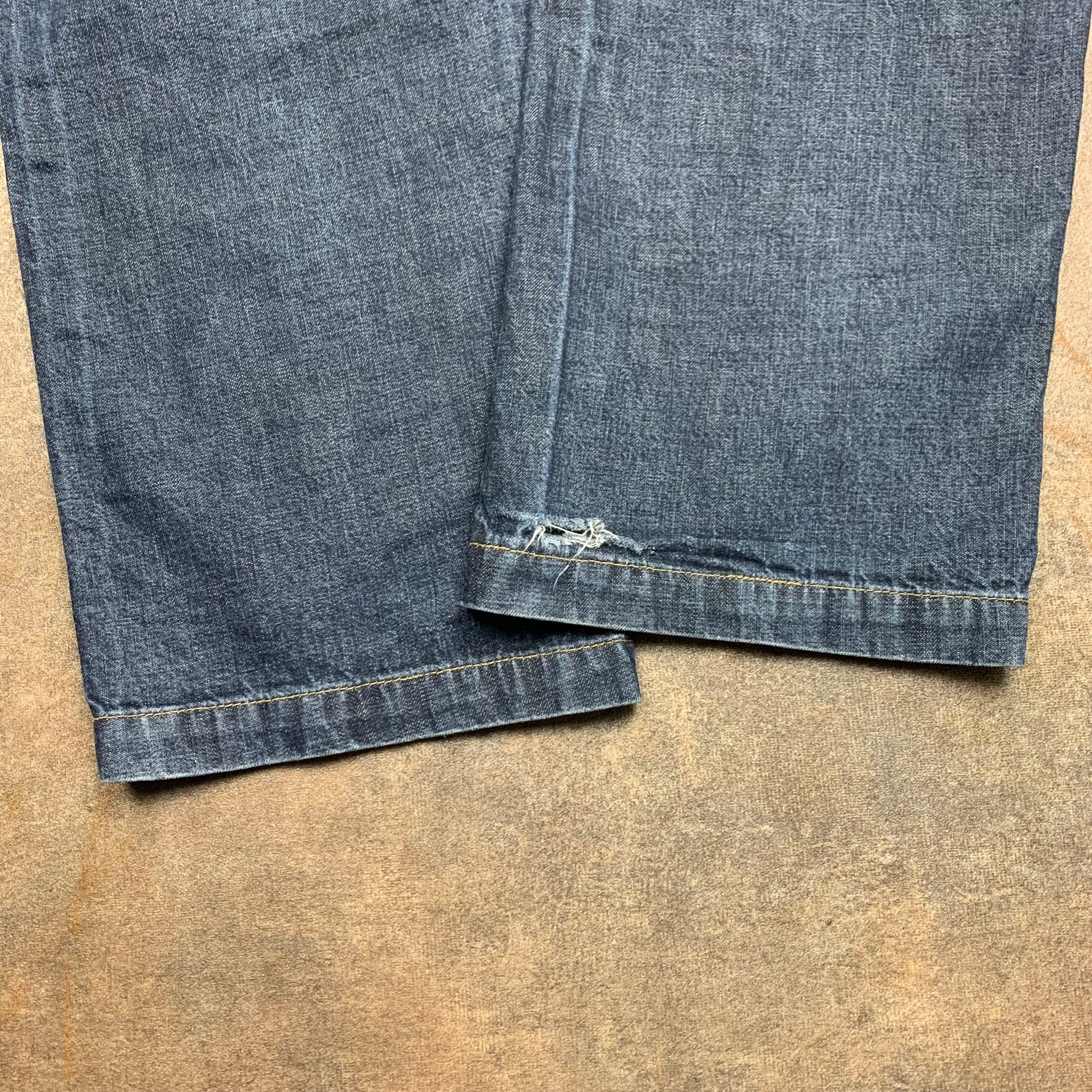 Software jeans with a branded tab on the carpenter pockets, coloured navy all over, in a baggy fit & in excellent second hand condition with a rip to the bottom of the right leg as shown.