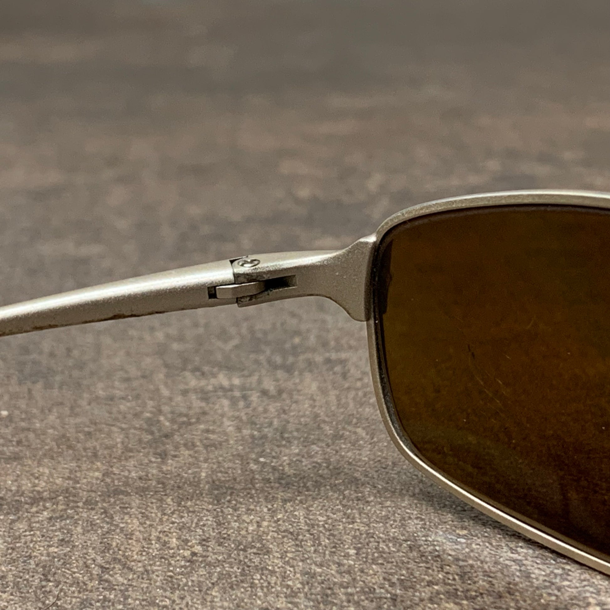Rare pair of Oakley wire sunglasses in a square shape, featuring a thin metal frame & in very good second hand condition with wear to the lenses as shown, only visible under bright lighting.