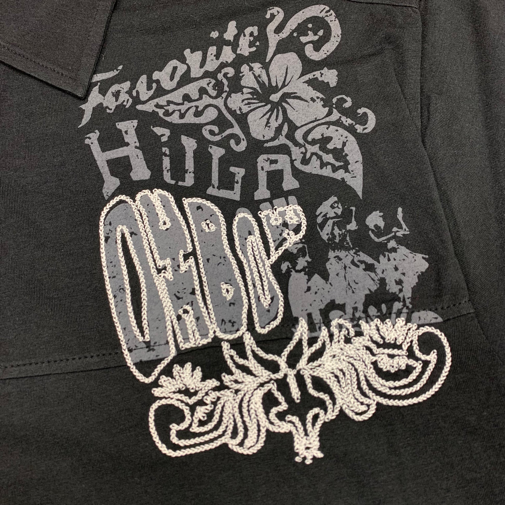 Vintage surfwear polo with a printed / embroidered graphic at the top of the front and a small logo at the bottom of the front, coloured black all over, branded buttons and brand new with tags.