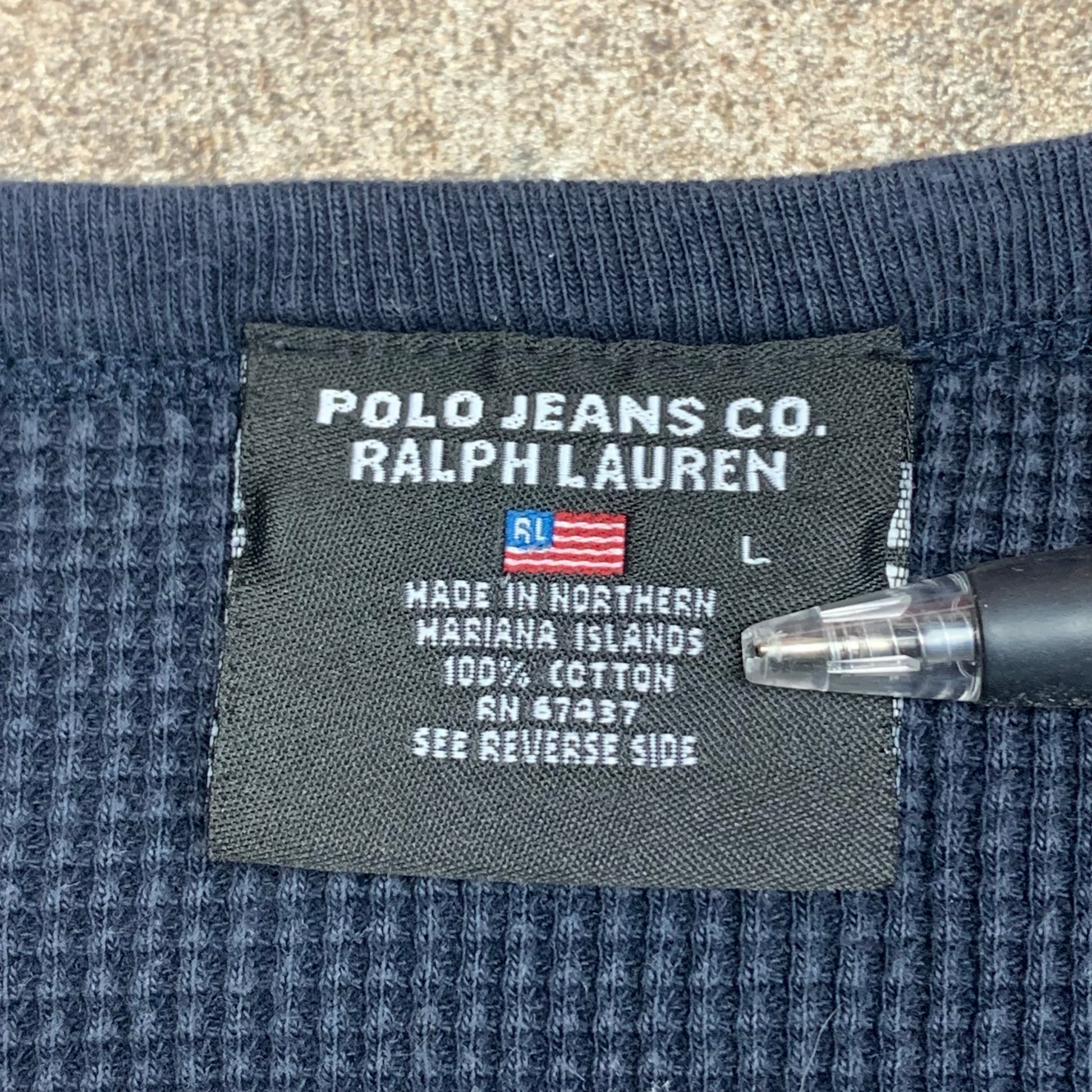 Vintage Polo Jeans thermal with an embroidered logo on the front, coloured dark navy all over, made from a waffle/thermal material & in great second hand condition with a small tear to the sleeve cuff as shown.