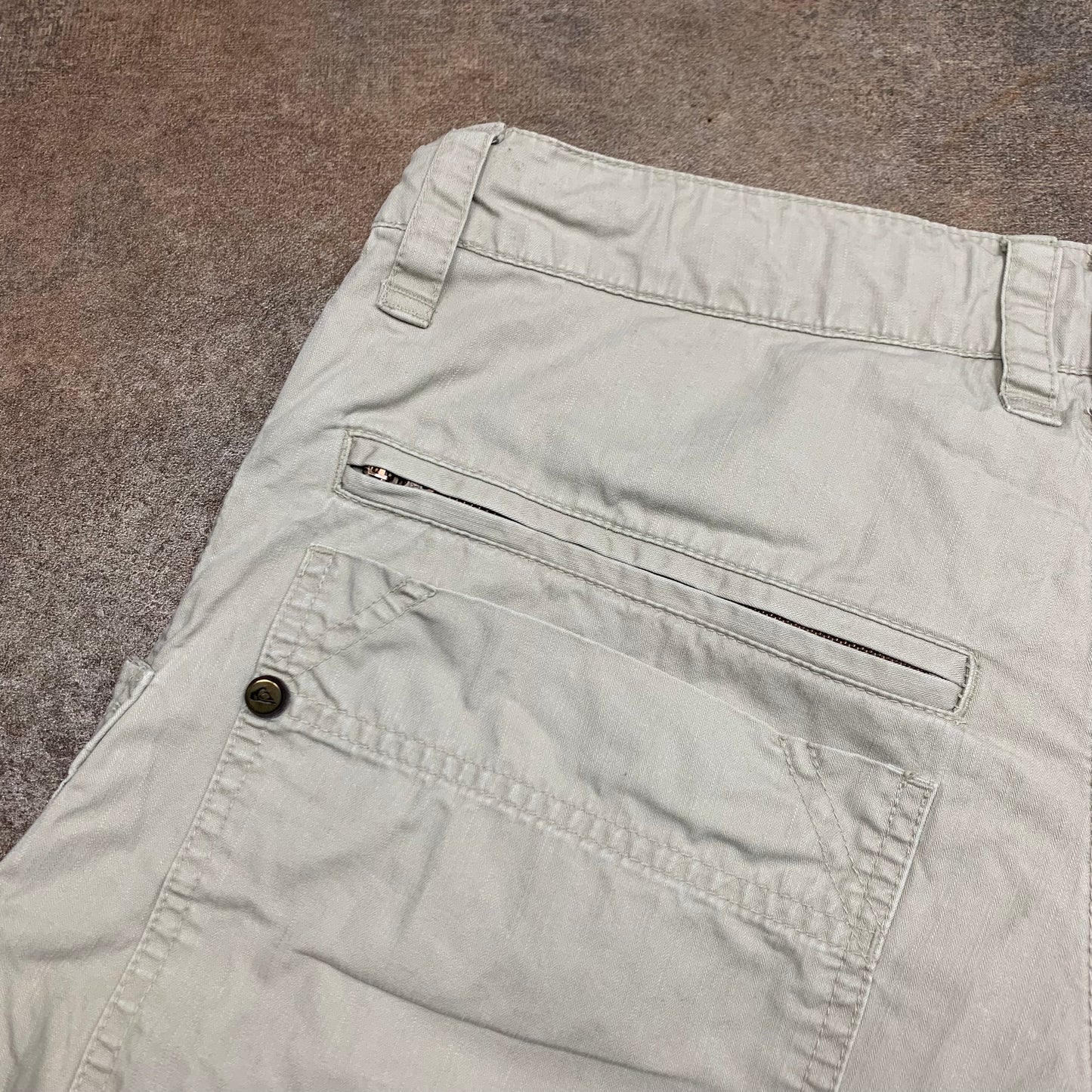 Vintage Quiksilver trousers with embroidered graphics back & front, double knee panelling, coloured cream all over, in a baggy fit & in excellent second hand condition with a small mark on the front as shown.