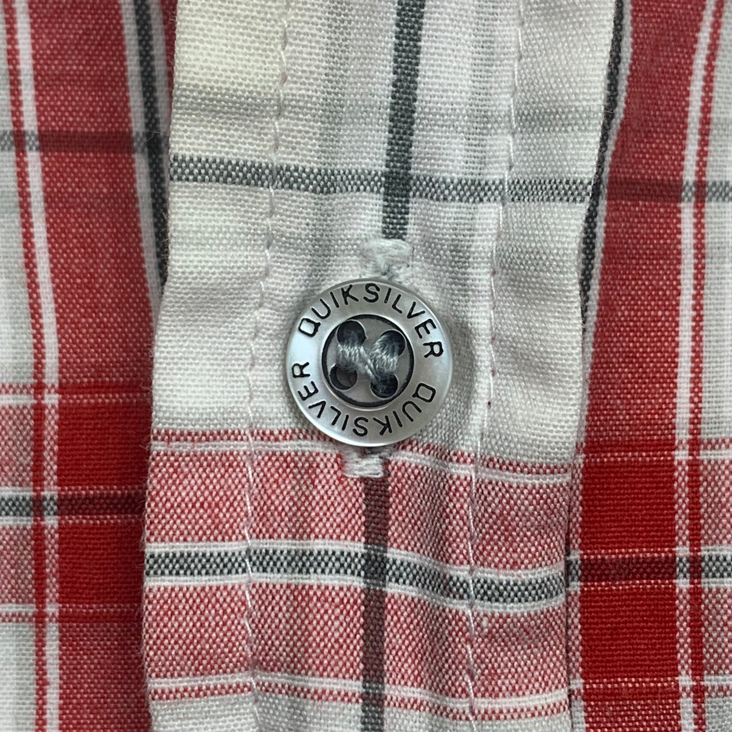 Vintage surfwear shirt with an embroidered logo on the front pocket, detailed buttons, branded tab at the top of the back, coloured white and red in a plaid pattern all over & in good second hand condition with some stains as shown in the final photo.