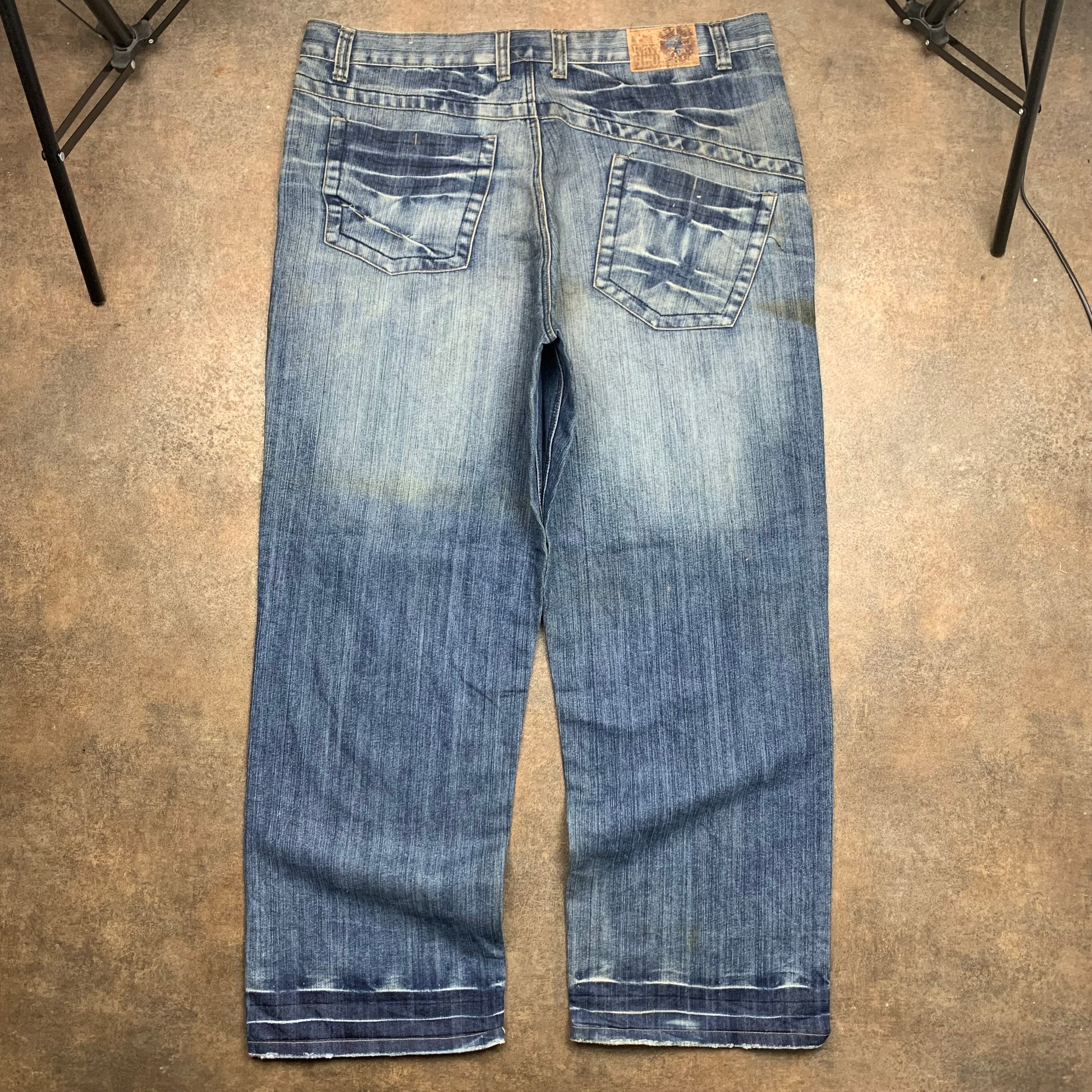 Vintage Raw Blue jeans in a super baggy fit, logo detailed jacron at the top of the back, coloured faded / washed blue all over and in good second hand condition with wear as shown.