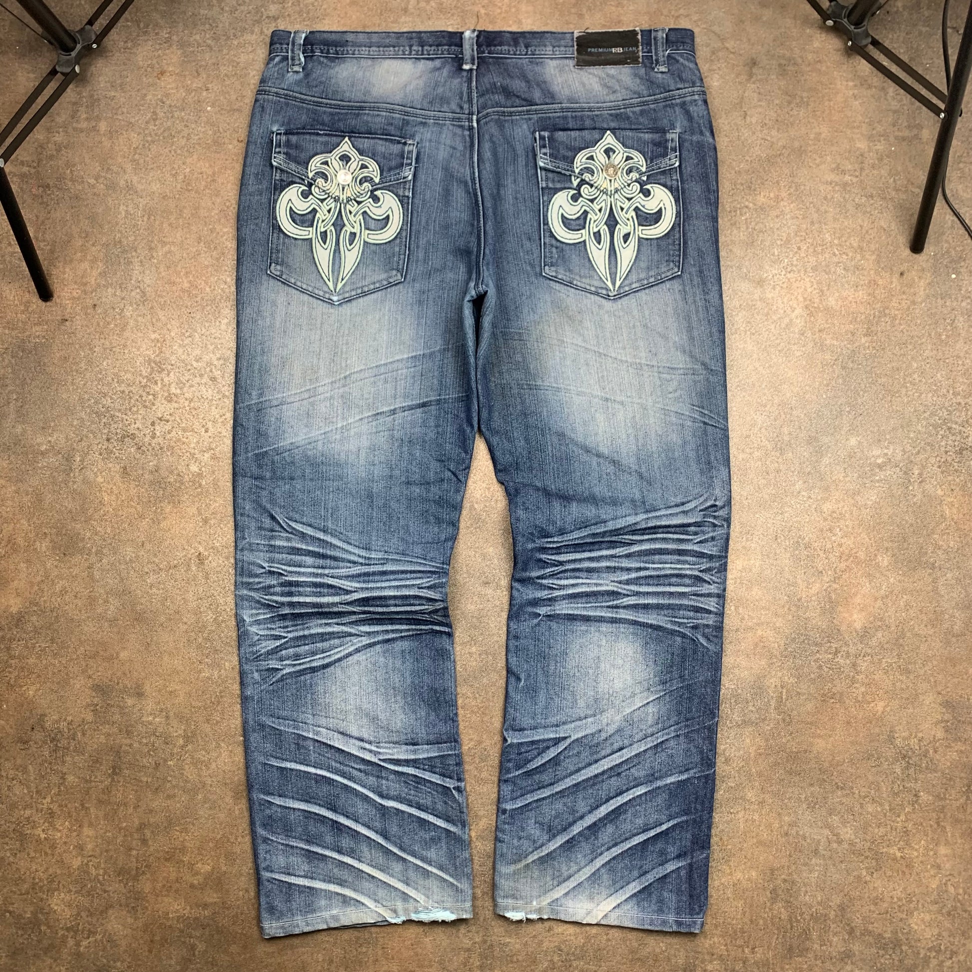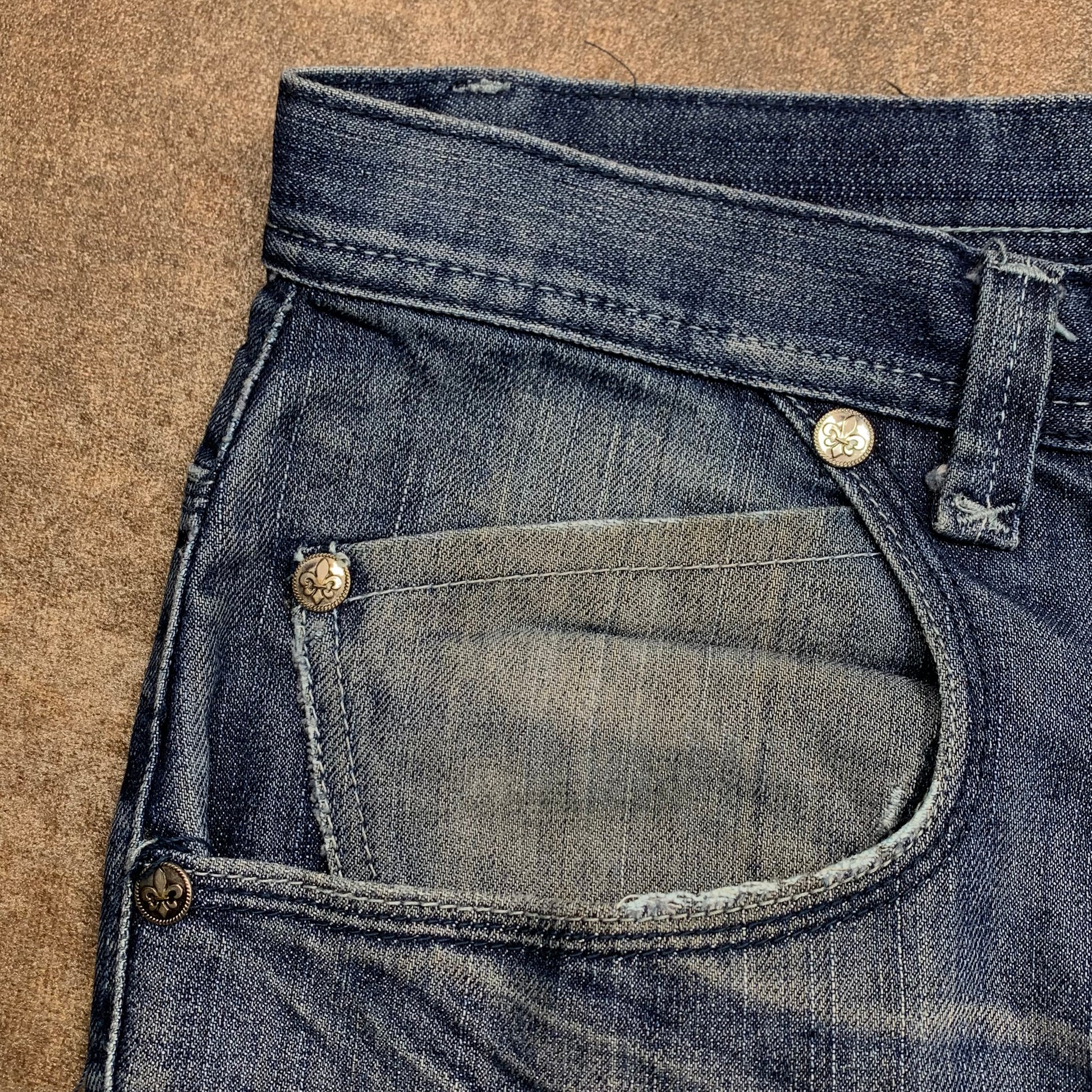 Rare Raw Blue jeans with fleur de lis graphics on the back pockets, logo detailed jacron, coloured washed blue all over and in good second hand condition with wear / repair as shown.
