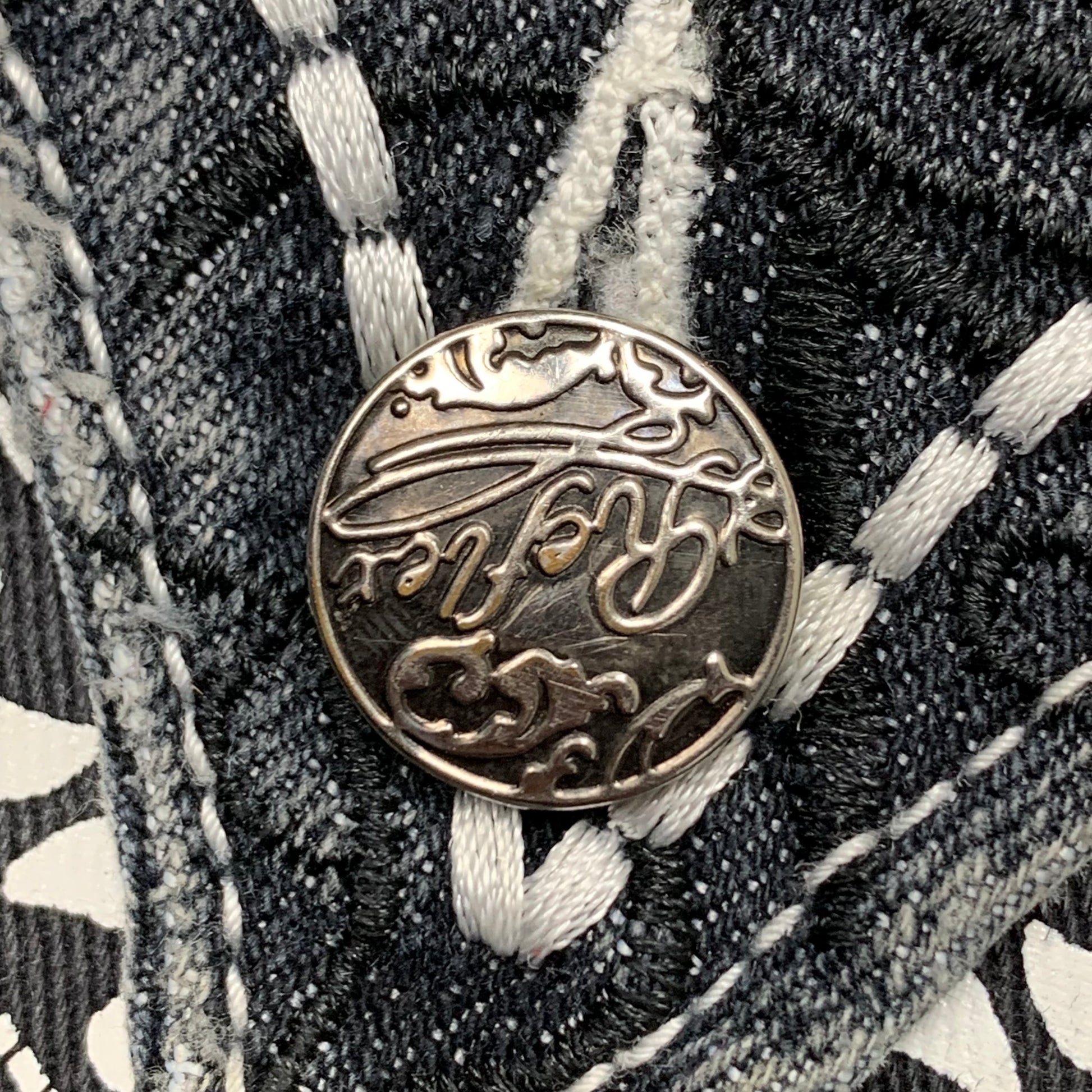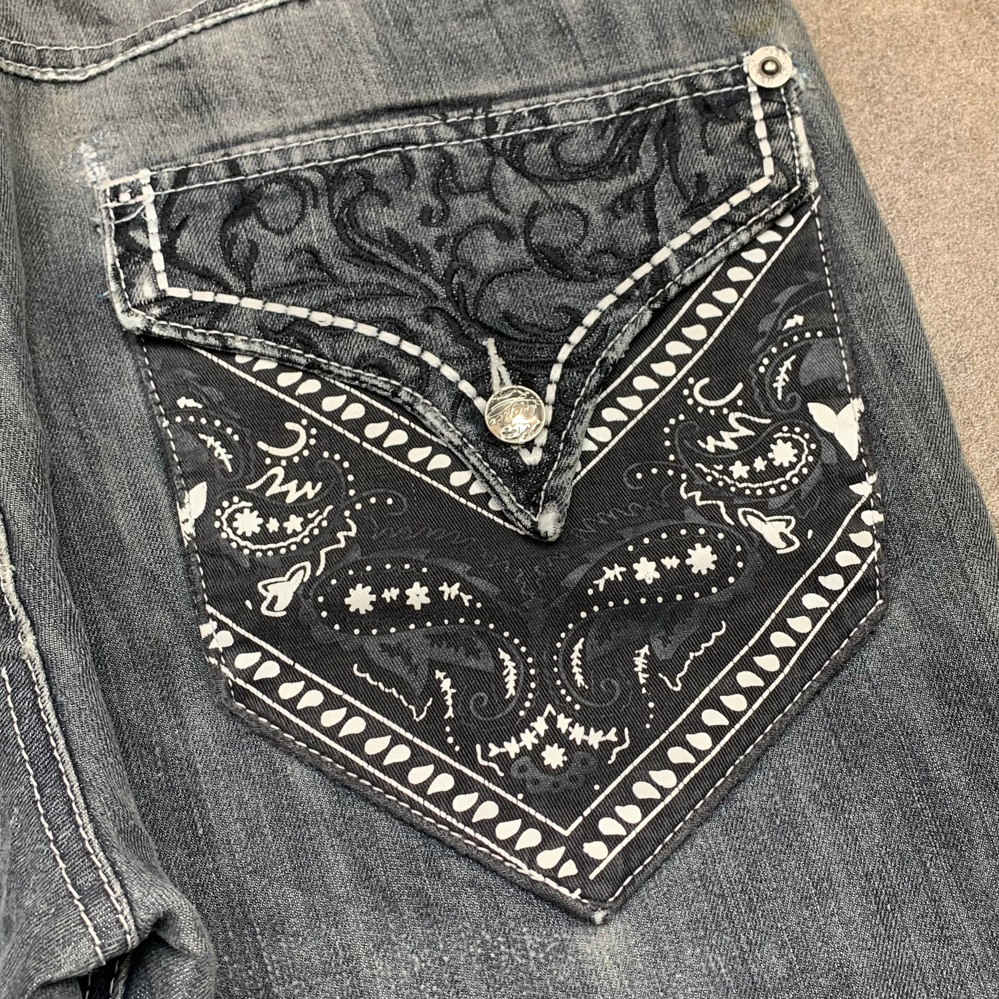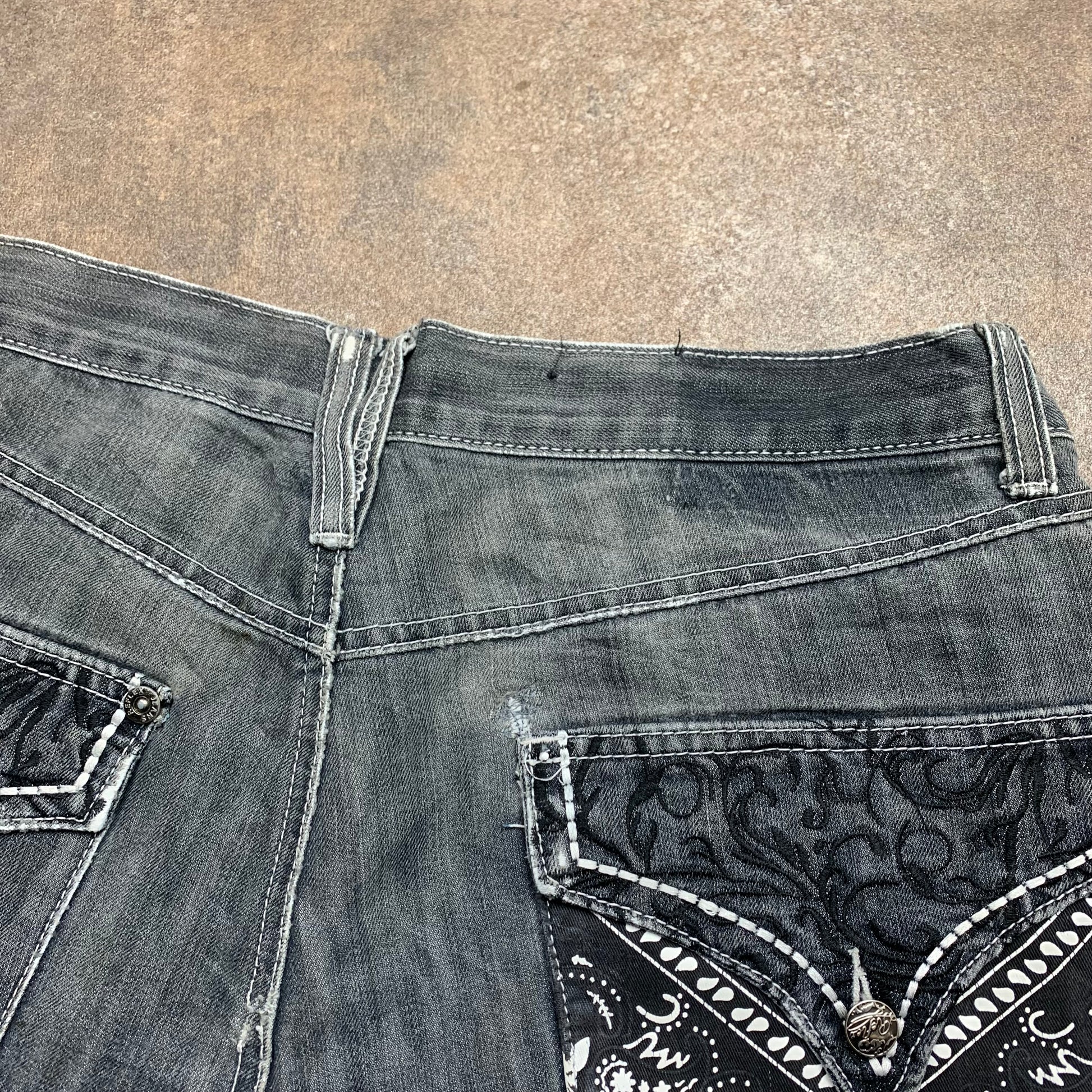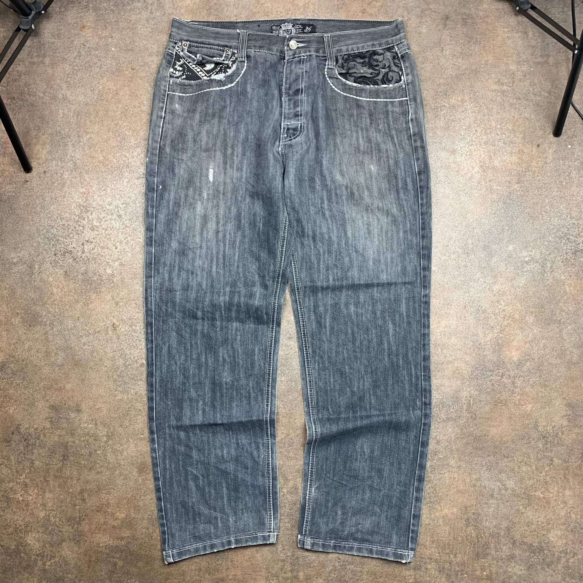 Rare Reflex tribal jeans with a bandana graphic on the back right pocket, embroidered graphic down the left leg, coloured dark grey all over & in good second hand condition with wear / repair as shown, adding to the grunge look.