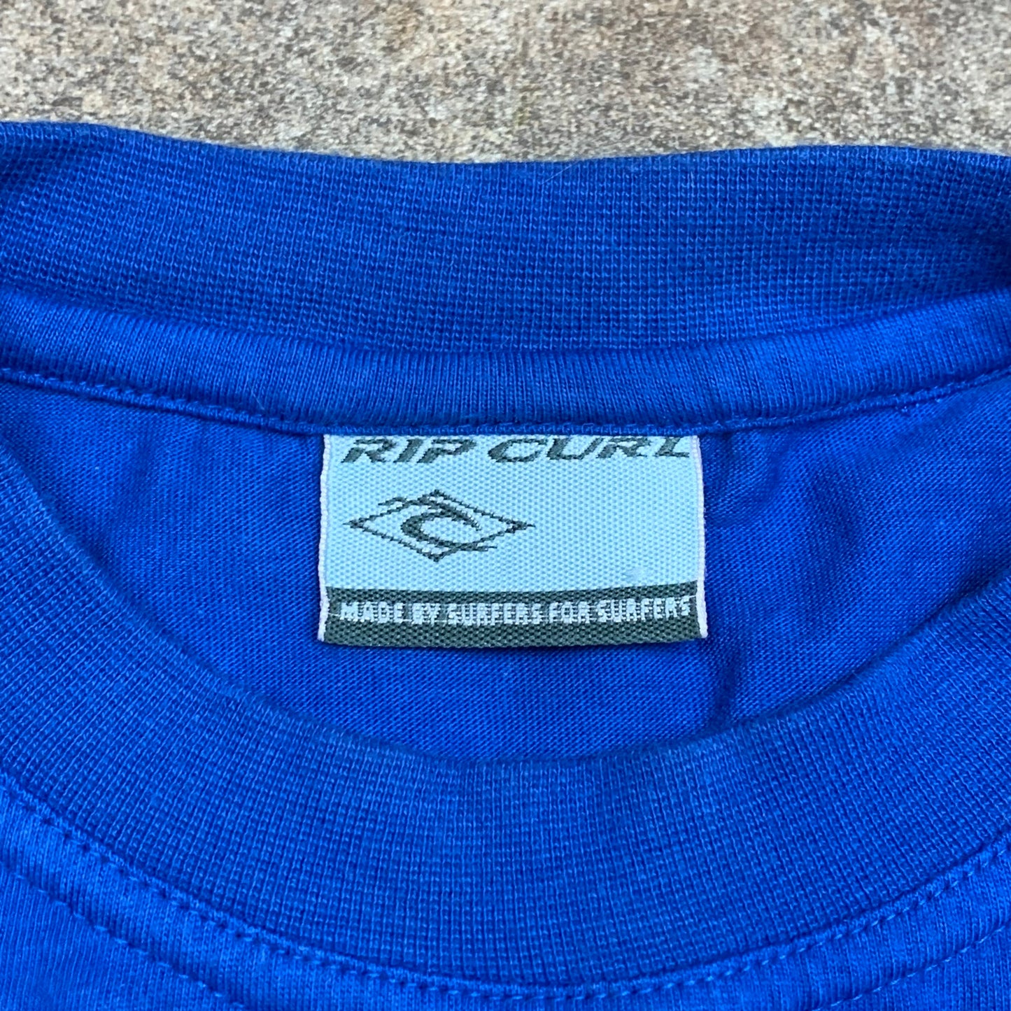 Rare vintage surfwear tee from Rip Curl with a printed flame / surf graphic on the front, coloured navy / blue all over & in great second hand condition with a mark at the top of the back as shown.
