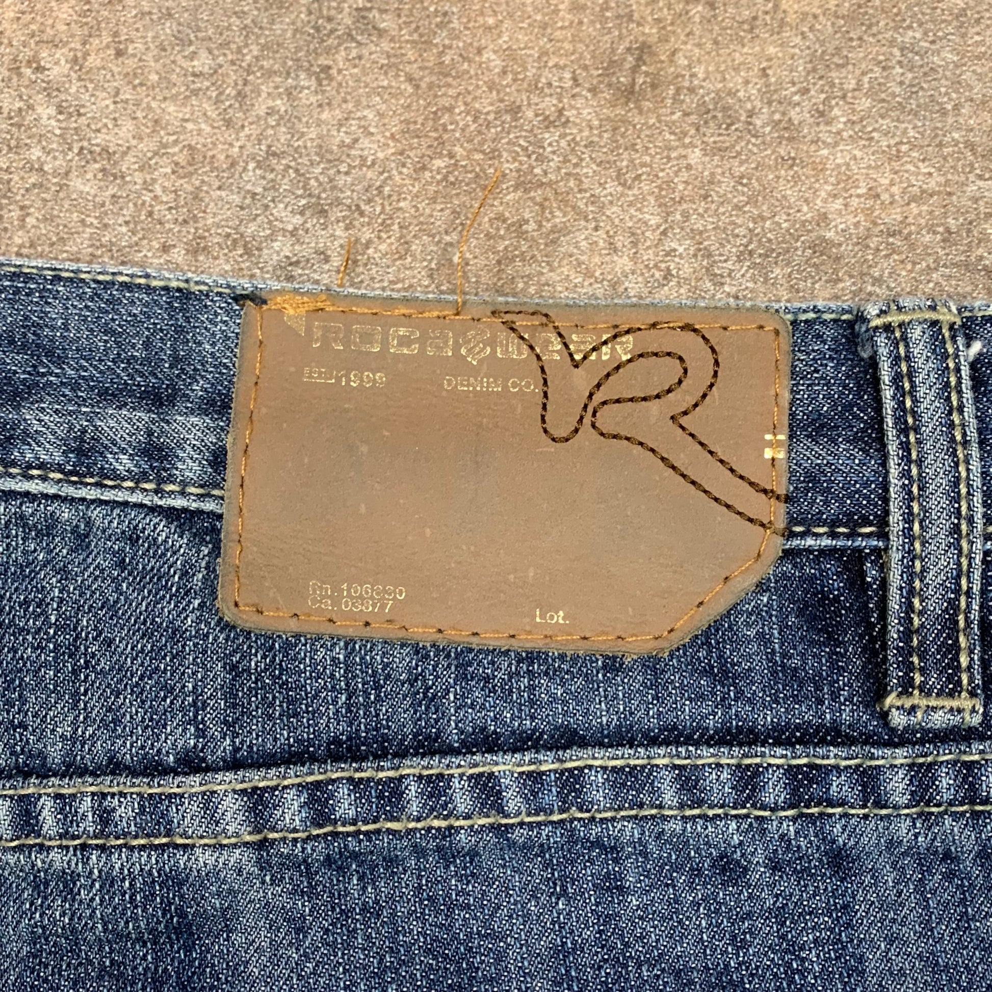 Vintage Rocawear jeans with an embroidered graphic on the back right pocket and inside the front right pocket, coloured blue all over, baggy fit & in excellent second hand condition with little to no wear.