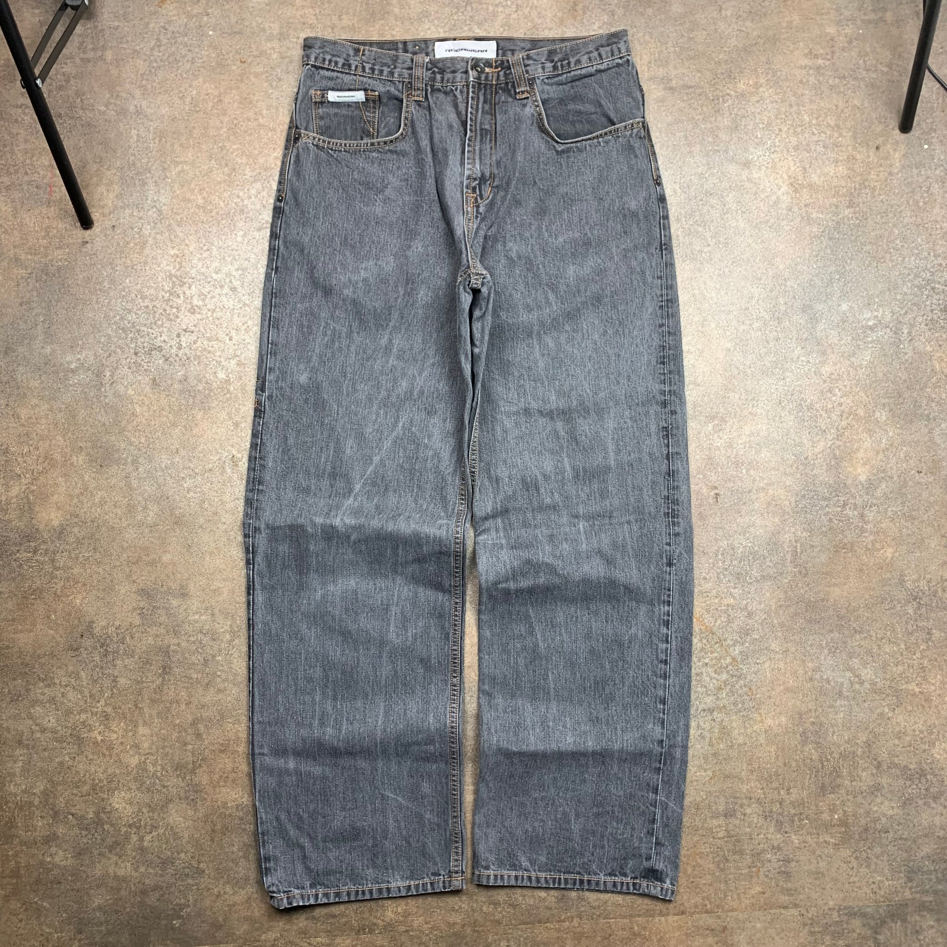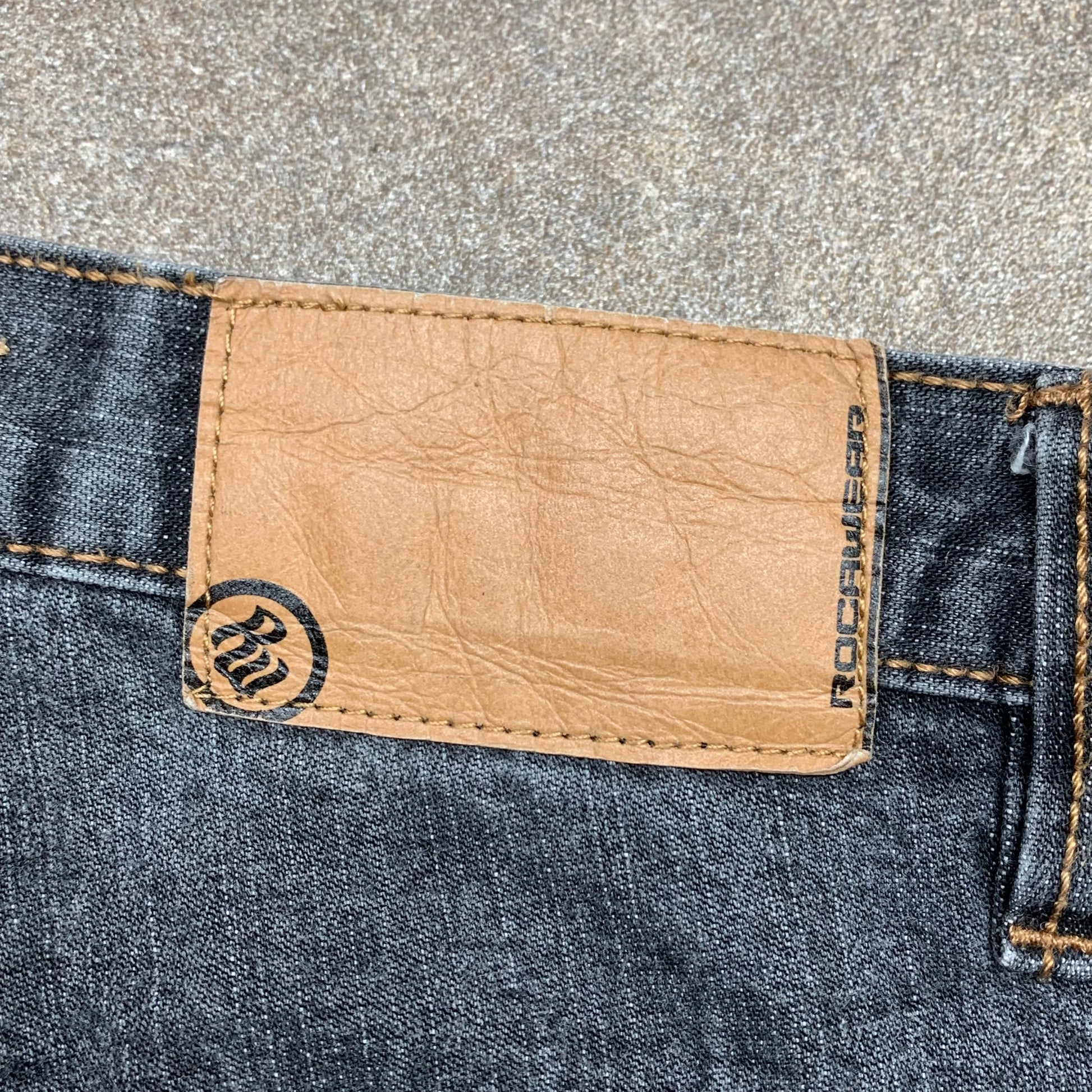 Vintage Rocawear jeans with an embroidered logo on the cargo pocket / orange stitching all over, coloured grey, branded belt patch / tab in the inner right pocket and in excellent second hand condition with little to no wear.